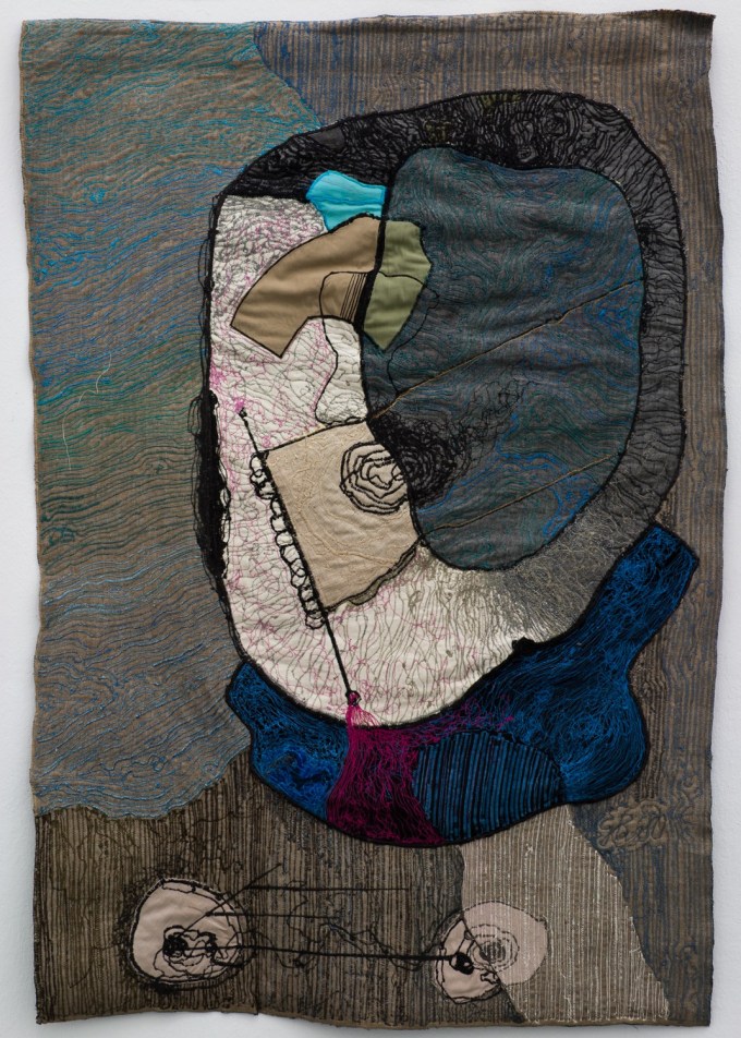 Brătescu shied away from politics: she dismissed feminism as ‘a uniform’, played down the experience of life under Romania’s repressive communist regime, and declared her studio to be an ‘apolitical’ space. Yet, the centrality of the body throughout her oeuvre hints at a certain political intent. For a series of works inspired by Medea (the Medeic Forms of the late 1970s), Brătescu used her mother’s old clothes and created a method she called ‘drawing on textile with sewing machine’. These unsettling abstract textile works suggest the violence and conflicted desires of womanhood, as well as the stifling strictures society places on them. Aesop, another mythological figure, featured prominently in Brătescu’s work as a joker; her fondness for him and for the more modern fool Charlie Chaplin suggests a similarly disruptive design behind her ludic lines. In the late drawings, they impishly morph into smiling faces and shapes that evoke breasts, ova, and sperm, evoking a defiant joi de vivre that mocks autocrats and old age alike. Following Brătescu’s lines lead us into a space both playful and profound, where our expectations of avant-garde culture, age, and gender are upended and a joyous chaos of form reigns.