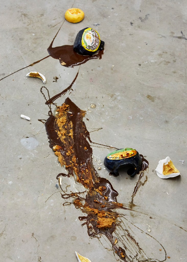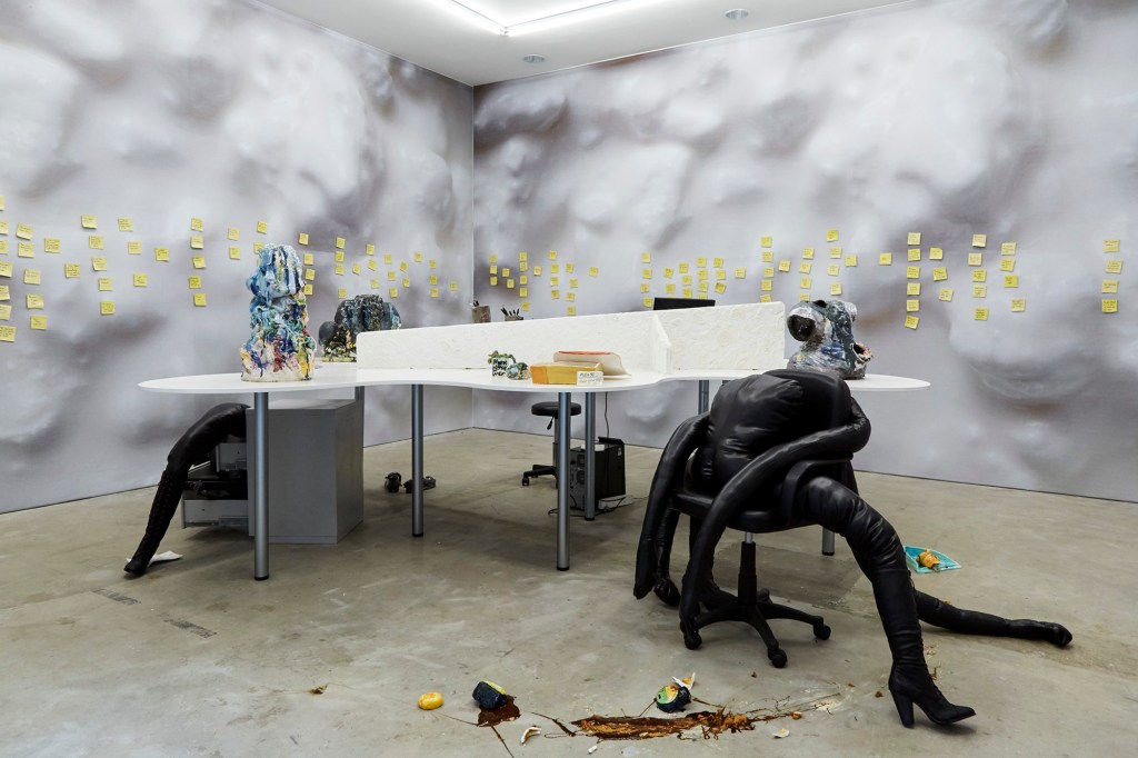 The value of craft in art and its association with women’s work, as ‘taught by women aimed at men’[iii], is something of a cliché. Anne Carson has written about silence, evident as catastrophe, as a confrontation of cliché. It’s a kind of noise that exceeds– as an answer to, or evasion of – the sense of a question that merely seeks affirmation[iv]. In Lindsey Mendick’s show The Ex Files, work pushes its forms and bursts into kitsch – an excess where the narrative that the work is taken from, here a breakdown of a relationship, is repeated back in fragmented surfeit. A standard and contemporary office is strewn with ceramic smashed marmite jars, disembowelled t-shirts and a textile, bi-corporeal, headless, self-fucking office chair sprouting an arse, legs and heels. The walls are covered with ceramic post-it notes, hand-written. The glazing techniques strongly ground the work in the twentieth century, where it can move in and out of relatable nostalgia and memory. Being within temporal reach and within the mundane, it has a greater scope to move through its cliché. The blurring of domestic and office environment, ornament and textual creates boundaries to then seep through, embodying the ‘Live Form’ that is emphasised through explosive objects and the detritus of a has-been relationship.