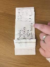 Within the space of the exhibition, we see the letters bound within a book and laid upon the shelf behind glass. The exhibited letter complicates Deleuze’s theorisation of the fold as an ‘endless’ movement, and instead presents the fold in a static position.[5] In contrast, my bookwork subverts the stationary archived fold in order to create an alternate archive of the fold in motion.