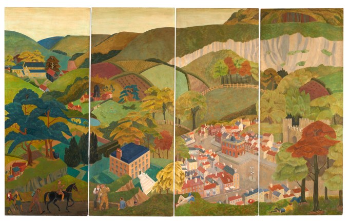 Useful, too, are the artist biographies, collected and collated by Llewellyn and Alanna Jones. These are a veritable gold mine for future research projects: could anything be more tempting to a researcher than the phrase ‘little is known about…’? Alongside Llewellyn’s introductory catalogue essay, these biographies give a sense of the professionalisation of women artists during this period, and the career opportunities available to them. Some of my favourite works at the exhibition were designs for murals, such as Barbara Jones’s The Resort (1950), Doris Zinkeisen’s [‘Work’] Artist’s record of mural designed for the Arts and Crafts exhibition (1916) and Margaret L. Duncan’s Reigate and its Environments (late 1930s).
