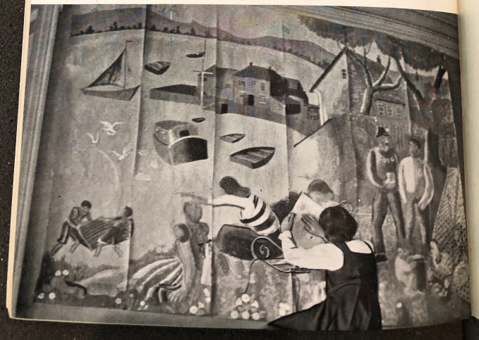 Over the past few months, I’ve been researching women muralists from the first half of the twentieth century, including Dorothy Annan, Mildred ‘Elsi’ Eldridge, Mary Adshead, Nan West, Evelyn Dunbar and Olga Lehmann. I’ve yet to establish what drew so many women to the mural form, but I’m beginning to piece together networks of women muralists, especially those working in art education. Before visiting the exhibition, I spent the morning in the University of Leeds’s Special Collections reading Athene, the journal of the Society for Education in Art. In it, I’d come across a 1942 article by Peggy Angus on her use of murals with children evacuated from Streatham High School to Chichester. Angus describes working with students, teachers and fellow artists to produce a series of four murals depicting local scenes, designed to instil a sense of civic awareness and appreciation for the new landscape in which they found themselves.[5]
