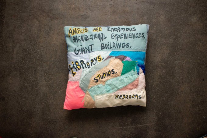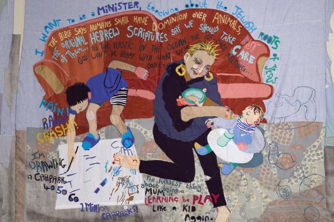 For her recent exhibition ‘Journey to the Centre of the Couch (Couches & Other Good Ideas)’, she transformed the Humber Street Gallery into a living room: the stitched fabric scenes were hung to form a long circular wall, creating an intimate space which invited the viewer to get close to Dorton’s subjects and their stories. Cushions and lamps enhanced this atmosphere; Dorton wanted visitors to ‘relax, sit down, and feel at home’. Dorton is skilled at connecting domestic scenes to larger narratives of social inequality, late capitalism and ecological crisis. Her subjects voice their own sense of being implicated in challenges faced by the wider world, with one woman, a recovering heroin addict, explaining that ‘I can relate to the destruction of the planet because of my own destruction of my own body’. Many of Dorton’s subjects express ‘[grief] at the state of the planet’, fear, and depression but there is also a clear sense of hope, recovery, and care running throughout the work.