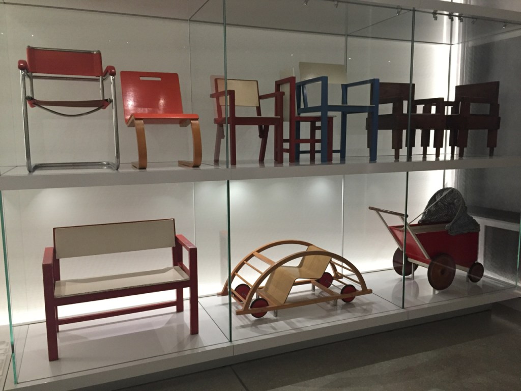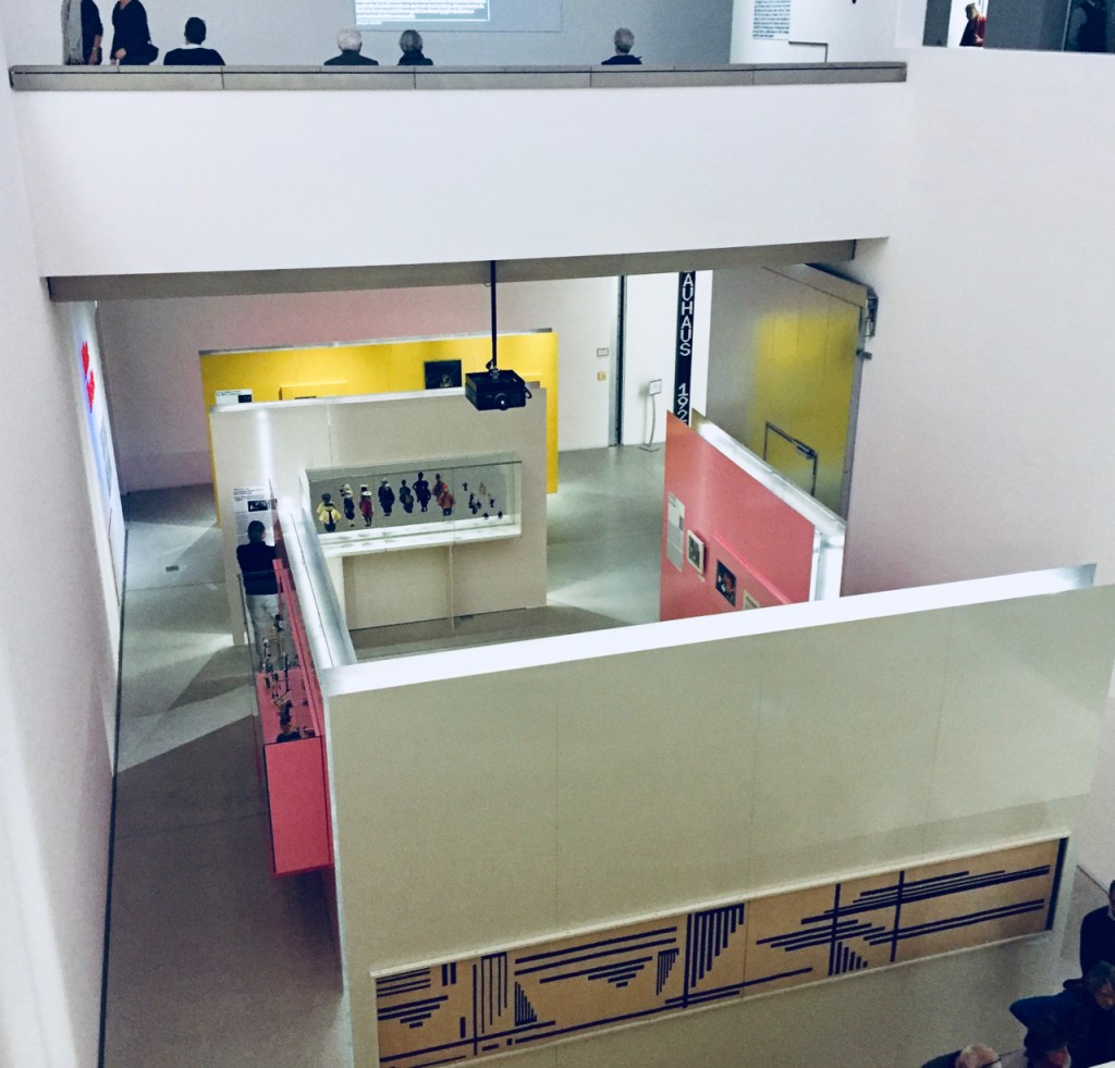 There are plenty of lovely objects in Dessau too, in particular furniture, textile samples, lamps, and even a rare Bauhaus dress made by Grete Reichardt from fabric she herself designed. Interestingly, the original nucleus of the Dessau collection gets its own space, with collages by Marianne Brandt side-by-side with Lyonel Feininger woodcuts. In 1976, on the occasion of a commemorative Bauhaus exhibition, over a hundred objects were bought from the exhibiting artists (including Brandt!) and thus the Bauhaus Dessau foundation was born, after years of the site being neglected. A document with the original itemised list of purchases is nearby, and the collection seems to emerge out of this cocoon to expand across the vast space where the rest of the exhibition resides.