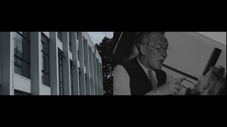 Exploring transferences between past and present, and the fluid exchanges between technology, bodies and buildings, the visual sequence rapidly cuts between archival footage and the clinical blues and coldly diffused light of Sagar’s vision of the Centre. These split images and sharp cuts are smoothed and bound together by the metronomic rhythms of the artist’s voiceover, detached and impassive as it intones arbitrary instructions and fragmented observations.