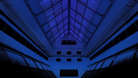 Visibility and observation are core themes in the work, mediated through a series of recurring motifs related to transparency: the refracted surface of the pool water, the glass partitions and windows, and various digital imaging technologies. We watch as bodies occupy different positions in the centre: pulling themselves up through the ropes and hoops of the (no longer extant) gymnasium, swimming in the pool, jumping and landing barefoot on cork boards. We watch the artist, styled in 1940s costume standing at the viewing window, preoccupied by her own observations and uncomfortably aligned by the voiceover to ‘a certain type of disquiet manifest in our shared notion of a public servant’.