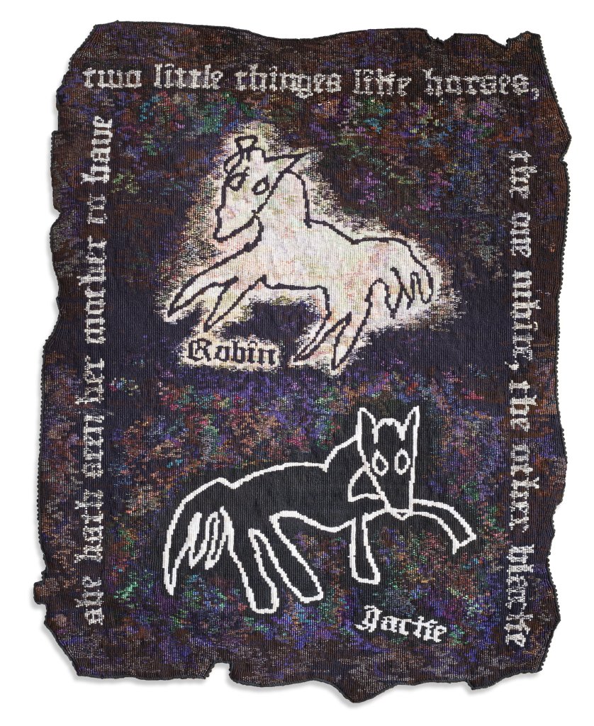 A number of the works in ‘The Witchcraft Series’ commemorate individual women, tried and condemned by English courts in the Early Modern period. The tapestries, made using a hybrid of knotting and woven tapestry technique, illustrate testimonies from witnesses or the accused, and sometimes from their young children. My source material is the trial documentation of these individuals. Does it represent the accounts of the women themselves? These were mostly illiterate, poor women, and their testimonies were recorded by literate, male court officers. The ambiguity of these voices, and the question of whose stories were actually being recounted, is part of what interests me.