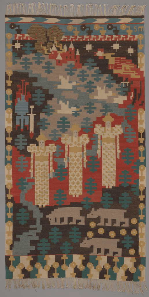 While working on my Ph.D., I began researching nineteenth-century Scandinavian design and decorative arts, which I knew little about at the time. Through this research, I encountered the work of the Norwegian artist Gerhard Munthe. A landscape painter turned designer, Munthe made watercolour cartoons for tapestries, which offer his interpretations of folktales, and these works greatly captured my interest. They have a marvellous aesthetic that adapts the geometric character prevalent in Norwegian tapestries from centuries prior into a modern form. Moreover, I became fascinated with the way in which nationalists marshalled Munthe’s tapestries (and decorative arts broadly) to construct a narrative of Norwegian identity and independence in the late nineteenth century.