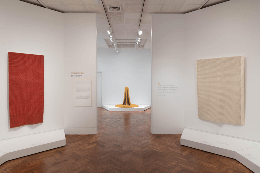 Researching the artists furthered my sense of the extensive and robust relationships they forged with one another and contributed to the installation “conversations.” A few volumes proved particularly essential to my research, such as Women’s Work: Textile Art from the Bauhaus (1993), Bauhaus Weaving Theory: From Feminine Craft to Mode of Design (2014), and Leap Before You Look: Black Mountain College, 1933-1957 (2015). Together, these three volumes helped elucidate connections between artists and highlighted the impact of an experimental pedagogical environment. Also, to better understand the artists’ points of view, I found the online transcripts of artist interviews, available through the Smithsonian Archives of American Art, invaluable! To give you an example of how the research, artwork, and design come together, in one of the galleries, there is a quote from Sheila Hicks in which she mentions the profound impact of seeing Anni Albers weaving; this quotation appears alongside a work from each artist. Both artworks were woven with the discontinuous weft technique as well as some of the same materials, but to distinct effects!