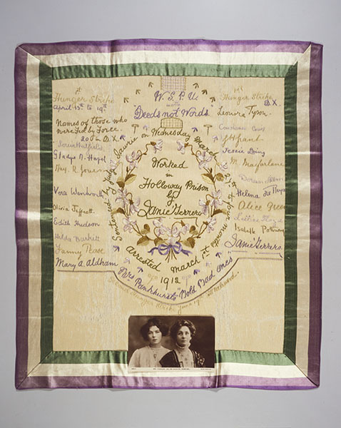 When one imagines a needlewoman from the early twentieth century, one is likely to envisage a pale and subservient figure, skirts sweeping the floor as she sits beside the fire, needle in hand, forging upon her lap another testament of her love for the husband she awaits so patiently. One will not see a smashed window, a stone wielding suffragette, her dedication to the cause (note – not her husband) plied upon the deceptively delicate folds of a silken handkerchief created within the confines of the infamous Holloway Prison.