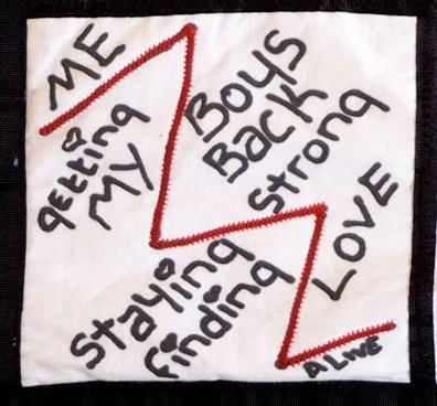 Some women wrote just one word ‘HELP’ or ‘Ashamed’; some wrote very matter of fact statements which were later embroidered with silver thread, such as ‘I found pills and ate them’. Women on the mother and baby unit used their babies hands and feet to make prints on the squares. Others were rebellious ‘Contained but never controlled’, ‘Don’t judge me”. Once it was completed, it toured the wings for everybody to see the women’s work. It was accompanied by some scraps of paper, a ‘visitor’s book’ for the women to express their feelings about it. The women wrote ‘I hope judges start seeing us as human beings’, ‘it has completely taken my breath away’, ‘nice to hear all our voices’ and ‘propa words by propa people!’