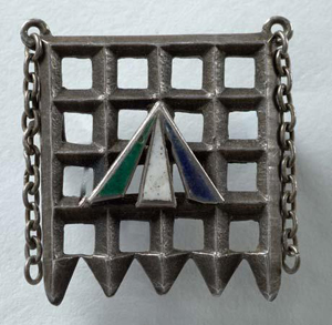 The design of the quilt was inspired by ‘The Holloway Brooch’, the brooch given to suffragettes for enduring hunger strike. The quilt is dominated by a large portcullis which frames 96 white squares each representing a woman’s ‘voice’. Within these squares the colour scheme is green, white and purple. Outside of the portcullis is a row of bricks made largely from the curtains and bedsheets salvaged from the prison’s laundry. A thick black edge of officers’ trousers offsets the brightly coloured words “LOVE, SEX, CAKE, MONEY” and “FAMILY, FRIENDS, RESPECT” – representing the women’s desires for the future.