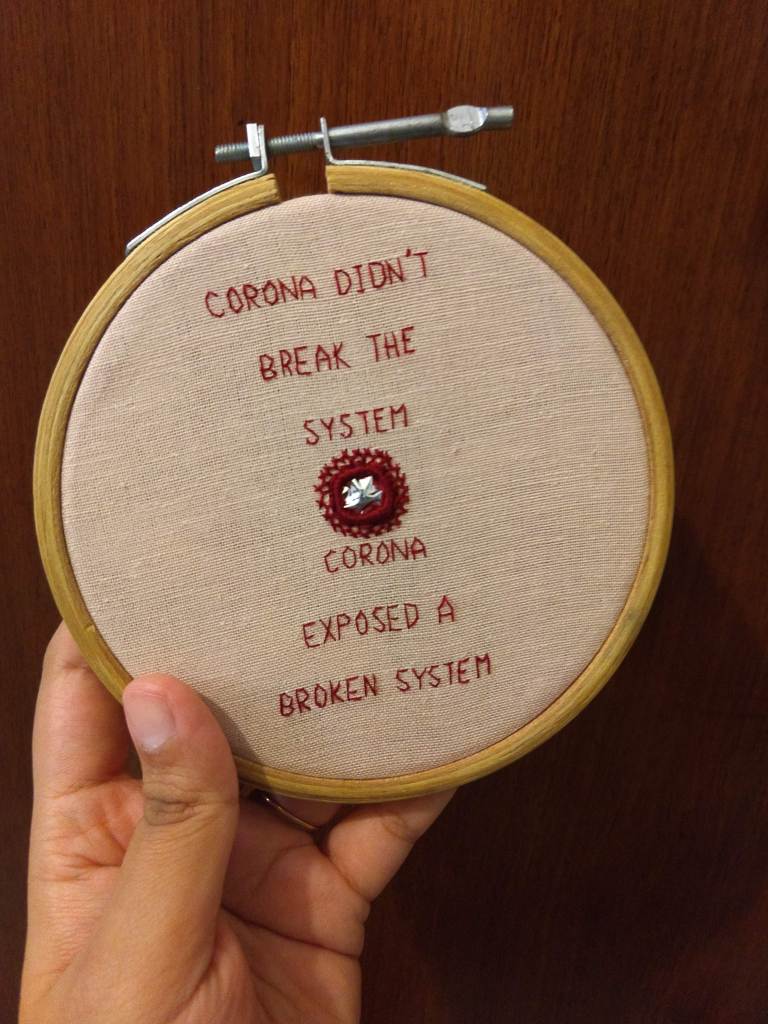 As being in isolation became the new norm, embroidery became an even bigger voice to deal with internal and external turmoil. I go back to my grandmothers, who not unlike the world now, also lived in isolation, using embroidery to engage with world outside their home. I continue to use my needle and thread to sew seeds of resistance in the only way I could while using my craft has offered a space for quiet reflection and slow action.