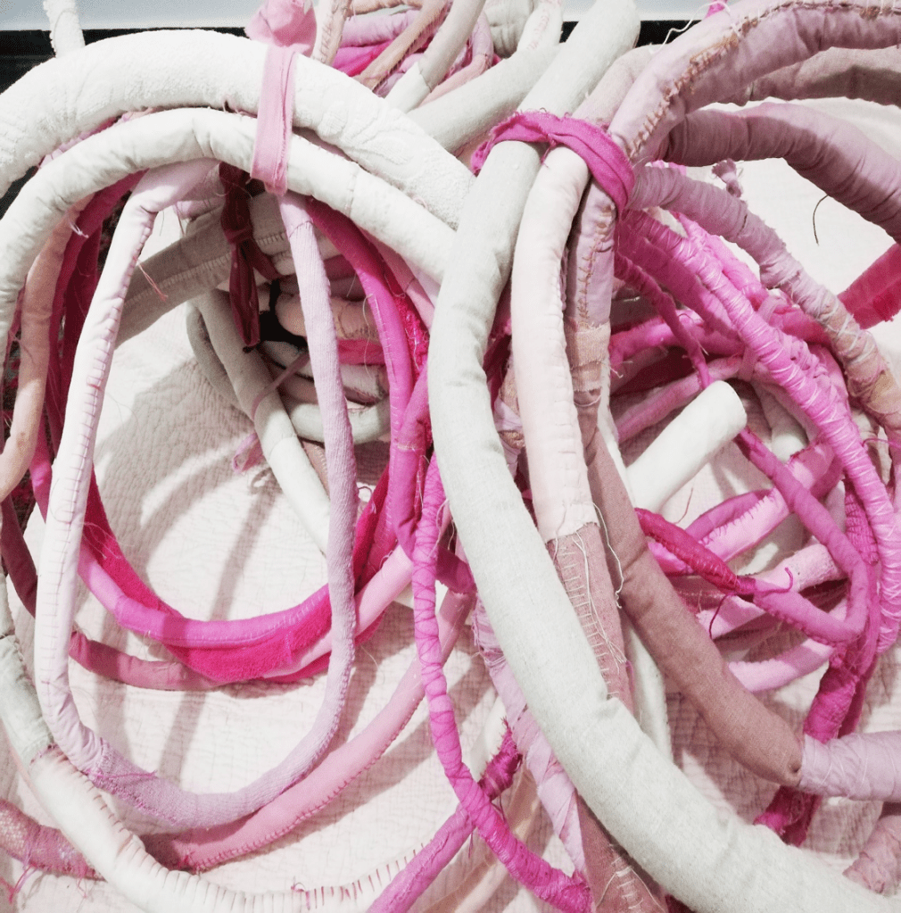 ‘Mother Material’ was made by the British, Madrid-based artist Barbara Long in response to the declining health of Long’s mother, Joan. Each tentacle is made up of textiles once belonging to her mother, found as Long was clearing out her mother’s house. Rags of old pillowcases, towels and dishcloths had been so lovingly folded and stored away that Long decided to memorialize these typically transient reminders of domestic life in her work. Some of the pieces had been stained pink by a cleaning fluid used for polishing silver; this inadvertent colouring would form the basis of the work, as Long dyed the materials, in combination with other found textiles in her studio, a series of pinks.