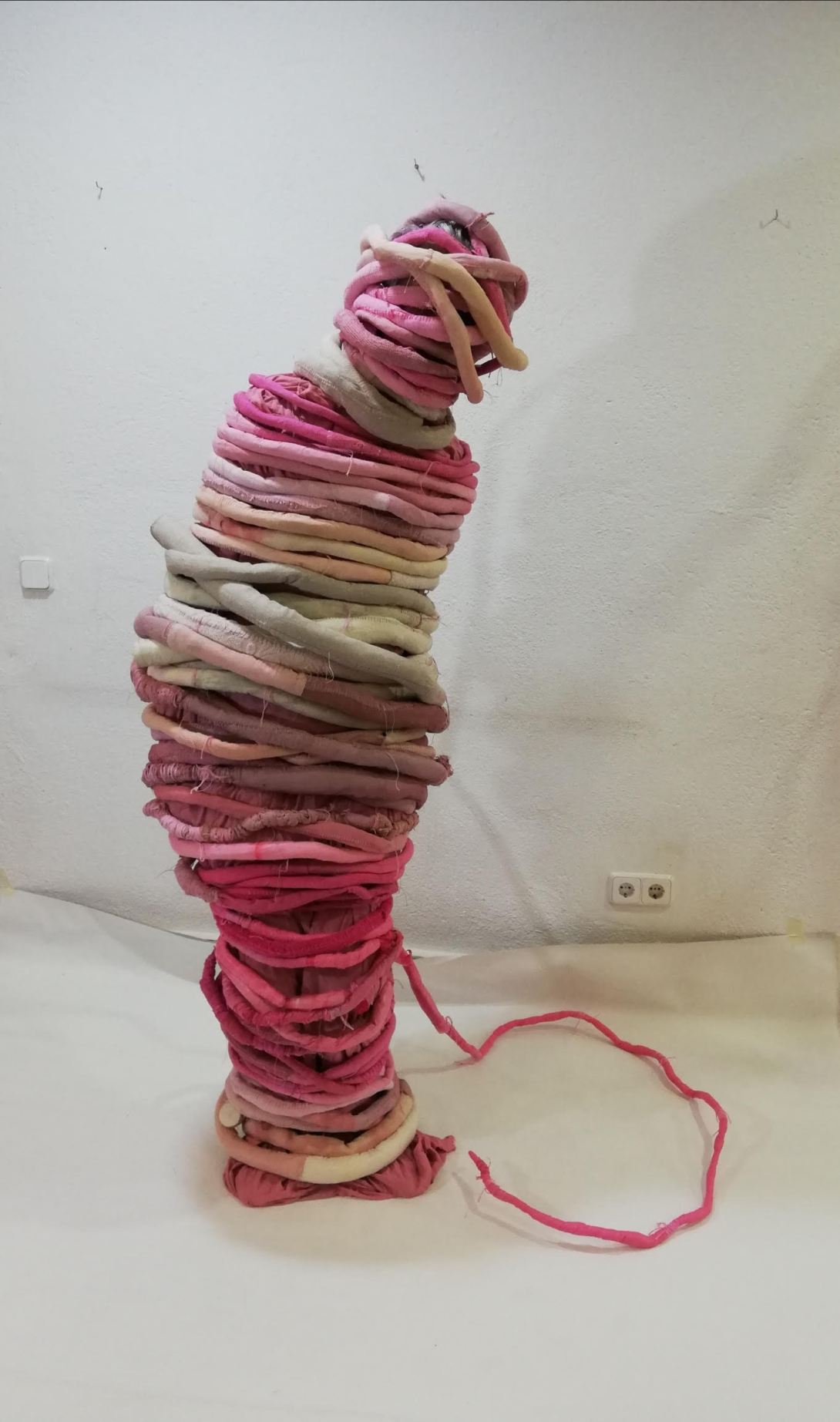 If you visited the White Lab Gallery in Madrid in 2019, you would find an enormous sculptural installation sprawling down the staircase of the gallery’s multi-storey building. With its pink tentacles wrapping around the staircase’s railings and settling into soft curls on the ground, it seemed as if the gallery had been invaded by some amorphous, primal substance: mother material. A closer look at a discretely placed label would confirm this impression, warning the viewer that this was ‘Mother Material – Handle with Care’, as the piece swayed gently against the viewer’s descent down the stairs. Reaching the ground floor, the viewer could even walk through a canopy of tentacles, allowing themselves to be surrounded in the work.
