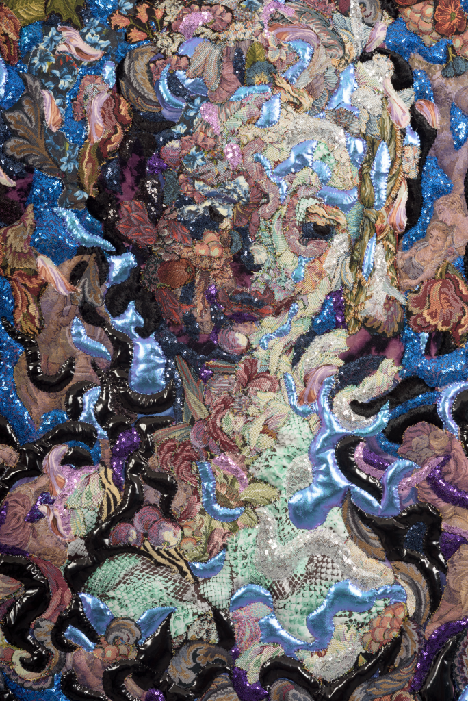 Lately I have been directly responding to the western art historian standards of beauty by appropriating paintings of 17th century old masters such as van Huysum’s Dutch still-lives and the portraits and Venus paintings of Boucher and Fragonard. My interest in the Rococo period lies in the marginalisation of its feminine and opulent appearance. I see the rococo period as a celebration of the senses, the sensual and overwhelming visual pleasures. It felt therefor appropriate to re-use fashion and decorative fabrics for the purpose of translating old masters paintings into fabric paintings. By reworking these decorative and fashion fabrics I would like to emphasize on these visual pleasures and make work that are a feast for the eye and bedazzle you with their looks. By creating a puffy or bloating effect to the fabric-paintings the work becomes more bodily and uncanny and even grotesque. One can see it as a tapestry on steroids. Even though you can’t physically wear the pieces, they could easily be transformed into a piece of clothing. Its surface has all the techniques borrowed from high fashion and in a different shape one could wear it. As the work is a celebration of material and ornamental pleasures and embracing female sensuality, it can also be read as a comment on our excessive consumer behaviour and self-indulgence. Both the rococo, allegoric, portrait and still-life paintings as subjects are seen as mere decoration of a room, empty paintings for the rich. The idea of the self-indulgent self-portrait translated into contemporary fabrics is a reference to the selfie culture and the need to be seen in a certain way. Most of the materials that I use are inexpensive industrial fabrics, but because of its shiny appearance it gives the work a luxurious impression that has it own irony in it.