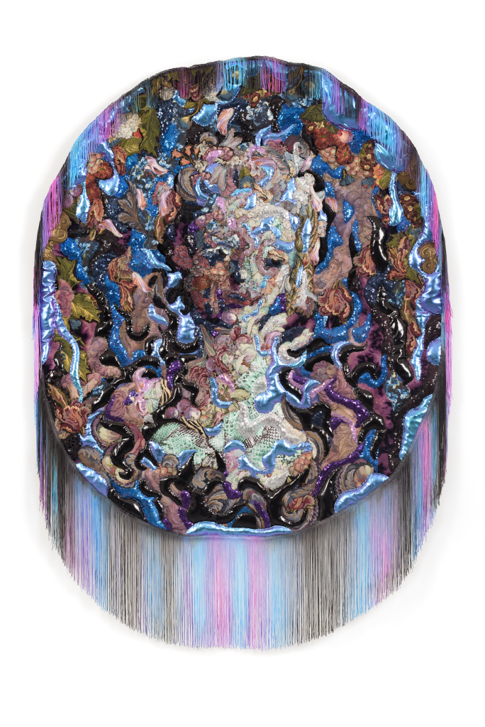 - Untitled (after Fragonard) 2020, 110 x 155 cm, Fabric painting: acrylic, spray-paint, synthetic-fabrics, tapestry-fabric, hand-embroidery, polyester wadding, and hand-dyed tassel fringes on canvas.