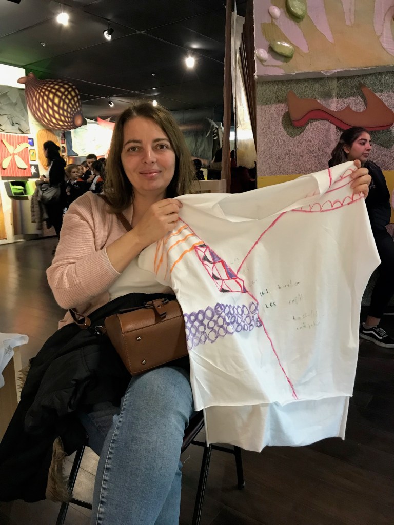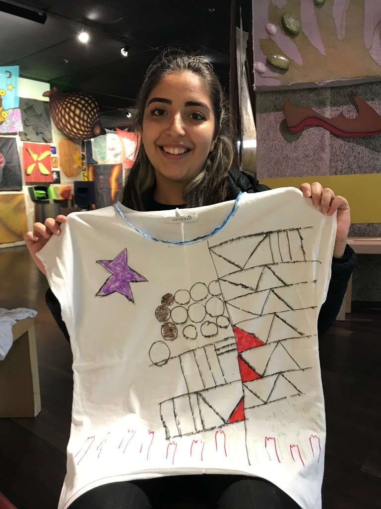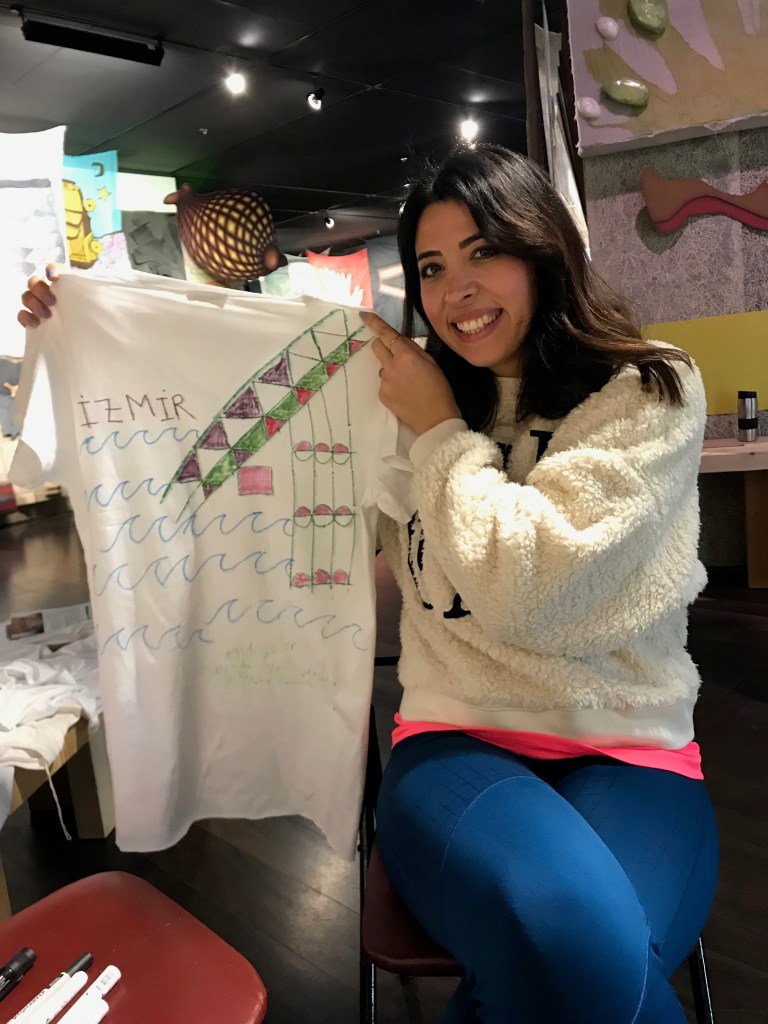 Ceyda Oskay (Jayda), is an artist, humanitarian consultant, and fashion designer who often works around themes of migration. She is particularly interested in clothes and textiles due to her experience with materials as introduced to her by her grandmother – whose own textile work was gifted by her school in Turkey to the Royal Family for Queen Elizabeth’s wedding. Ceyda is also interested in fiber and materials because the nature of textiles can be intertwined with language and symbolism, and textiles are easily transported, and socially significant in many nomadic, if not other, societies. Her co-written book chapter on the social and cultural significance of Al-Sadu nomadic weaving, has recently been published in All Things Arabia, by Brill Publications (2020). Ceyda also explores the wearable, the ephemeral, the performative, and the ritualistic in her fashion work with recent work like the Climate Change Raincoat: Diamonds are Forever, and so is Plastic (reference: phrase by an Australian designer using plastic wiring to make jewelry), and on-going projects such as the Talismanic T-shirts, t-shirts made specific to the wearer for healing. The shirts were made as inspired by historical protective talismanic shirts that span timeframes and cultures and Ceyda has extended this into a contemporary social practice gesture. Ceyda also designs custom-made clothing with painted, printed, dyed fabric and is always available for commissions for the Talismanic T-shirts, or other daily wear or sleepwear garments, or costumes for dance, circus, or theatre performances upon request. Sometimes, her textile work, inspired by long strips of nomadic weaving made across journeys, accompanies sound installations – such as her Sleepdust: Uber drivers singing lullabies, London March 2019 work. She recently completed an MA at the Royal College of Art, after a long career with the United Nations.