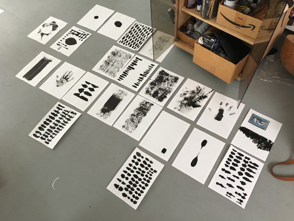 I make my way through Ibram Kendi’s Stamped from the Beginning. I find a shape haunting the text, the shape of a spinning top whose axis maintains itself through a constancy of small changes. As I read Kendi’s book, I begin to pull shapes to me that have a strong central axis. I dig out a wooden top and spin it across the floor, watching for the wobble and break. I devise wrapped rollers and soak them in ink to turn them across paper. I want to prove to you that you do in fact recognize when a pattern has gone into repeat.