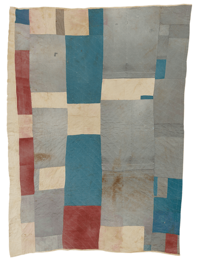 Throughout the area’s turbulent history, quilt making has been a constant. Quilts were a necessity, used not just as bed covers and blankets, they would also be placed on the floor and walls to insulate homes during the cooler winter months.[2] Due to a lack of materials and resources, quilts were created from scrap or recycled fabrics – predominantly old, worn-out work clothes, grain sacks and other found materials. These scraps would be pieced together in the most economical way, usually in large strips in order to create quilts as quickly and easily as possible.[3]