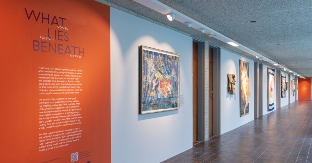 Naomi Polonsky is the Assistant Curator at The Women’s Art Collection , a permanent collection of modern and contemporary art by women held at Murray Edwards College, University of Cambridge. Walking into Murray Edwards College, artworks hang all around. There’s an Anni Albers sketch by the bathrooms, a Tracey Emin drawing in the reception. The collection numbers over six hundred paintings, works on paper, photographs and sculptures which are on display throughout the College and its gardens. We spoke with Naomi about her latest exhibition, What Lies Beneath: Women, Politics, Textiles, to find out more about how textiles play a role in the collection, the political power of craft, and curating in this unique space –––
