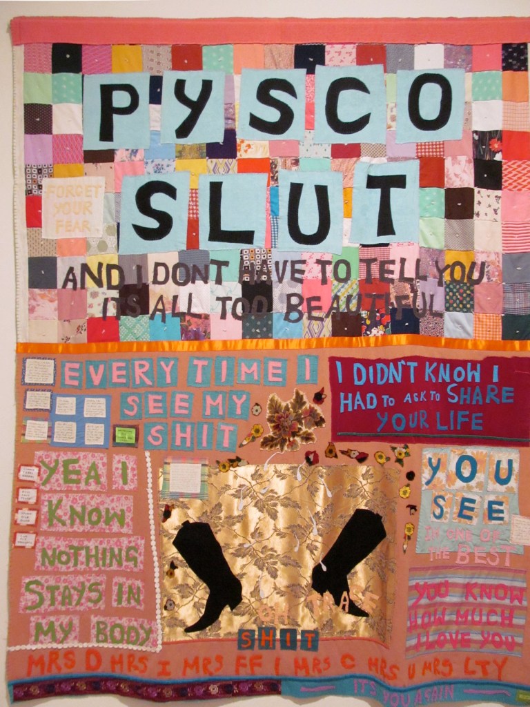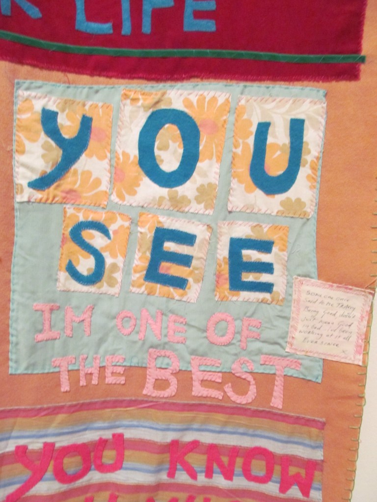 Tracey Emin’s needlework writing follows Hélène Cixous’s behest to create new forms of writing to avoid ‘the imbecilic capitalist machinery’ of publishing.[v] By creating literature through needlework, Emin uses a traditionally feminine craft to disrupt traditional forms of literature and express herself through an uncensored voice. Brown explains that ‘Emin’s highly poeticised, textual confessionalism has enjoyed favour during a period when much poetry has withdrawn into what often seems a cautious shyness.’[vi] As a literary academic, I naturally disagree with Brown’s generalisation of poetry being withdrawn in a moment concurrent to Carol Ann Duffy, Kae Tempest, and Claudia Rankine. However, I do believe that Emin’s ‘textual confessionalism’ is enabled by the pre-existing form of Confessional poetry. Although hotly debated, the term Confessional poetry typically refers to poetry written in the mid-late twentieth century that adopts a personal voice, colloquial style, and pulls from biography for inspiration. Poets such as Ann Sexton, Robert Lowell, and Sylvia Plath ‘exposed the family as a crucible of trauma, a site of emotional warfare that shapes the self, and frequently delved into the psychic wounds of childhood to uncover the secrets of adult distress’. By yoking the poetic genre to a disruptive use of language and domestic craft, Emin’s applique work builds meaning that is both personal and political.