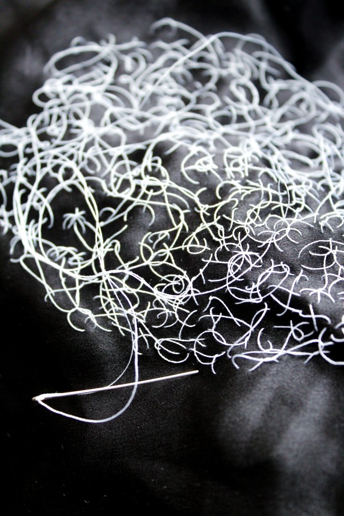 Visual poetry (or “vispo”), object poetry, sculptural poetry, language art are all terms that have been used to describe these poetries, which challenge the boundaries between literary, visual and performance arts, between art and craft, amateur and professional. Where the Concrete Poetry movement of the mid-twentieth century treated text itself as an object – with experiments in collage, shaped blocks of type and page patternings of repeated letters – a significant strand of current visual poetics is concerned with materiality. Practitioners are taking text off the page and into acrylic on canvas, phials of salt, wooden Jenga towers; on to plexiglass, walls, vintage linen, pebbles, eggshells. Kate Siklosi rubs Letraset on to fragile, degradable surfaces, such as tree bark and seed cases. Vilde Bjerke Torset’s “Complex Thought Hatching” combines asemic writing with embroidery, as thread loops through silk. In these works, the materiality is not decorative, or illustrative of the text, but an essential part of the poem: it is the poem.