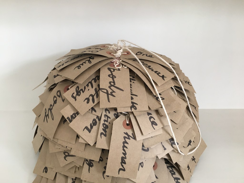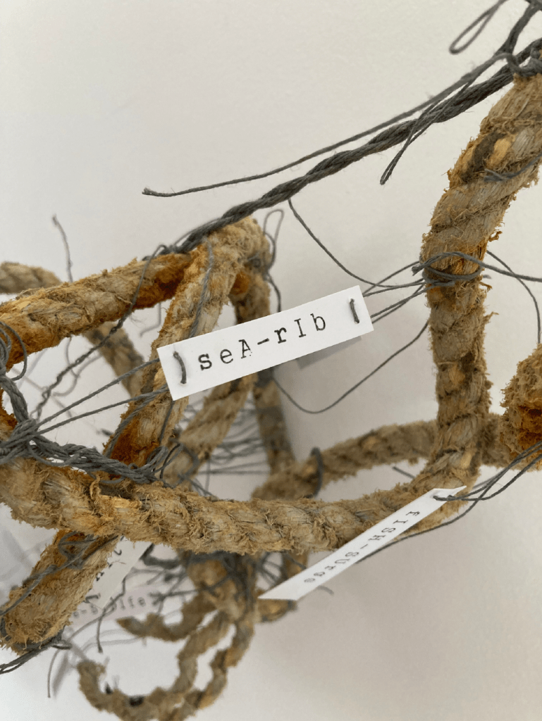 Where text does appear on paper in these contemporary material poetries, it has been cut, torn, mashed; rethreaded and interwoven with human detritus, plant gatherings. Briony Hughes’ “Kenning-Noise”, commissioned for the group show Text-Isles and published in the catalogue of the same name, combines linguistic and industry findings: a coil of abandoned fishing rope is strung with bookbinding thread and scraps of paper stamped with translations from Old English and Old Norse. “I want my reader to handle my poetry and take their own route through the text – this sense of agency and collaboration is important to me,” says Hughes. “Sometimes the page feels too contained or constricted, like it is calling me to put pen to paper to produce a sonnet or another historicised masculinist form. To work through this, I refigure what the page can be. Sometimes it is made of torn fragments or a 13ft long receipt scroll, but sometimes my page isn’t paper at all.”