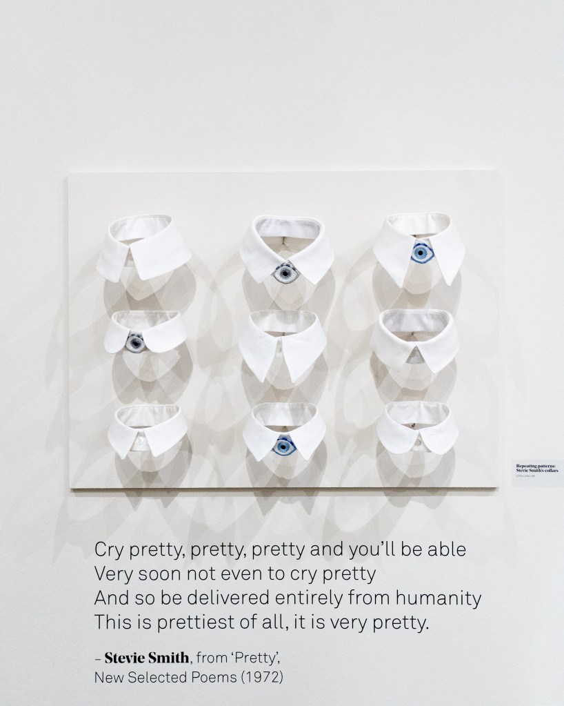SP: One of our ways into the exhibition was thinking about formal comparisons between dress and poetry. Both poetry and fashion operate through creating – and re-creating – formal patterns. For example, we thought about fashion rhythms and poetic rhythms in the case of Stevie Smith. Although her work, and her personal style, appear at first glance quite simple and childlike, the more you look, you become aware that something is ‘off’ and out of kilter. Almost every photograph of Smith shows her wearing a neat shirt collar, sometimes paired with an eye-shaped brooch. It struck me that this sense of repetition combined with strangeness carries across into her work; her poetry often employs rhyme and repetition, but the rhymes are slant rhymes, the repetition makes words increasingly unfamiliar, even meaningless, as in the case of the poem ‘Pretty’ (displayed alongside collars in the exhibition).