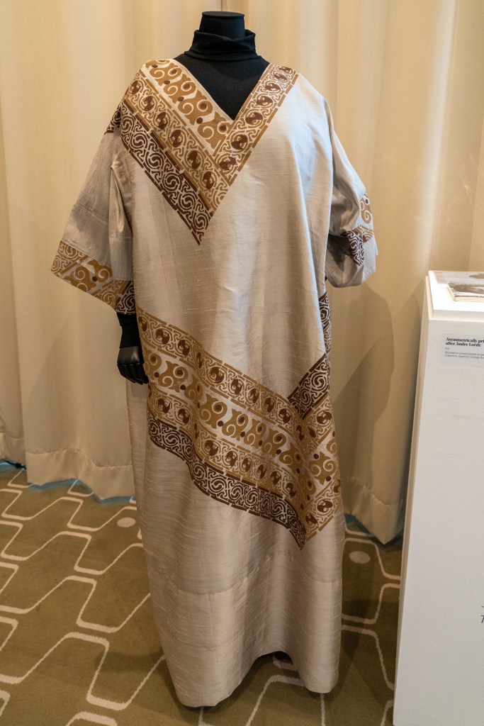 SP: A key element of our research process was to explore the poets’ own writing about clothes, whether in letters and diaries, in journalistic articles, such as Sitwell’s advice on ‘How to Wear Dramatic Clothes’ in the Daily Express, or in autobiographical writings, such as Lorde’s Zami and The Cancer Journals, in which she explains her decision to refuse prosthesis and to emphasise the asymmetry of her body after a mastectomy. This informed Gesa’s understanding of the pattern and cut of Lorde’s garments, when we viewed her clothes in the Spelman College archives, and it inspired our installation, an ‘Asymmetrically printed caftan, after Audre Lorde’.