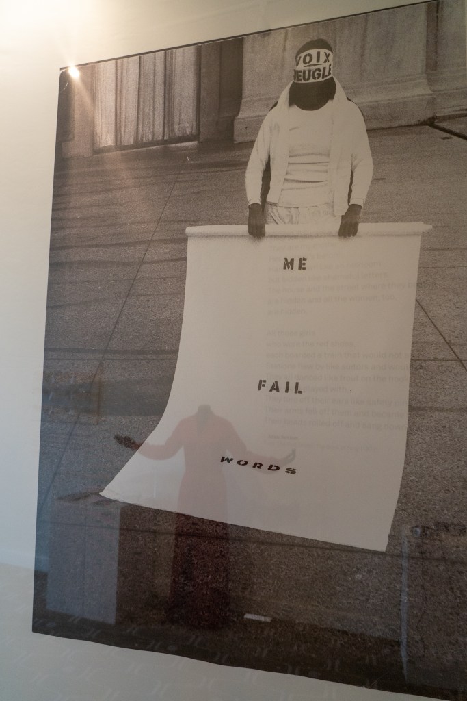 Theresa Hak Kyung Cha was another crucial figure in the exhibition to make this point about the politics of materiality: a poet-artist-filmmaker who used fabric and words as material in her pieces, whose body was crucial to her practice but never straightforwardly displayed. Just as she never admitted the straightforward legibility of language, which is of course not transparent. Cha’s use of fabric and dress in relation to her Korean-American identity shows the way words as material can be disorienting, they conceal and cover.