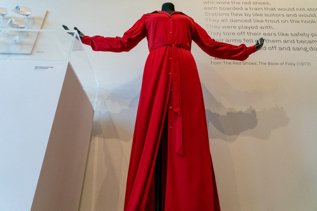SO: Hearing the recording of Sexton’s last reading, as well as reading the excerpt from ‘The Red Shoes’ on the wall and looking at her red reading-dress, we hope visitors get a small sense of what a Sexton reading was like. We’ve even reproduced her stance in a photograph I found in Goucher College’s archive: she stands with her arms reaching up, to embrace her audience. The long slit in her red dress would have revealed more of her body in these moments. These readings were consummate performances – as were her poems, despite her label as an autobiographical, ‘confessional poet’ – and her dress played its part. If you think of poetry as an expanded practice that includes poetry readings, clothes are one aspect of that.