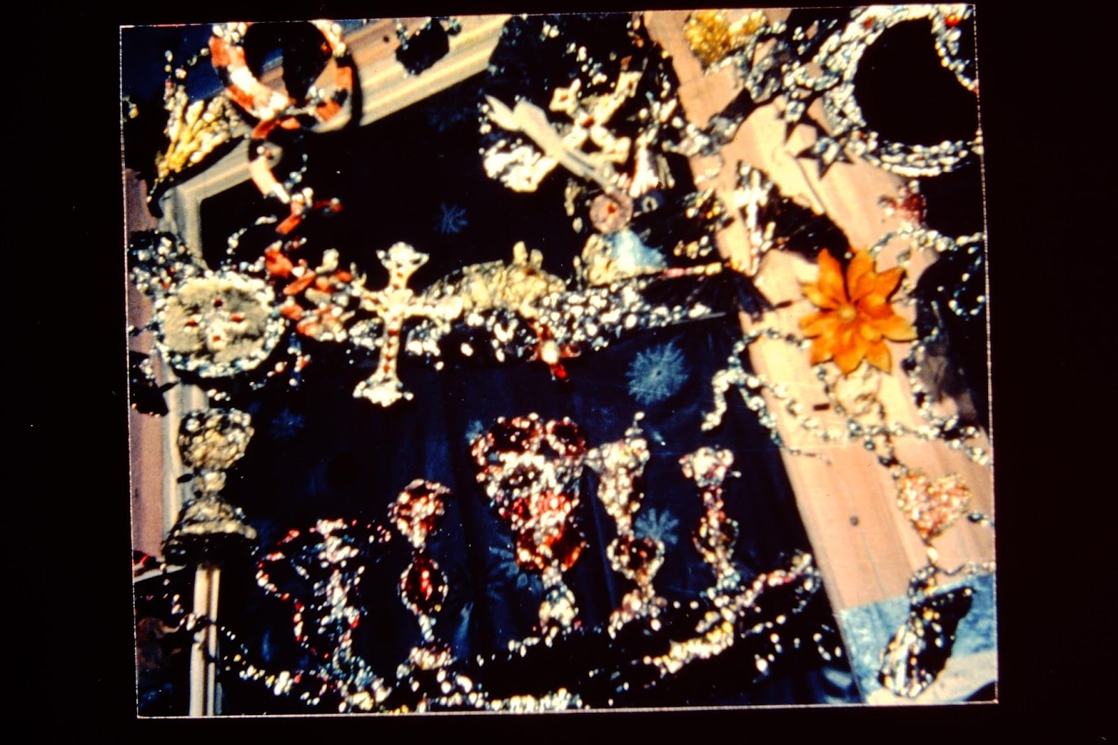 The flyer promises “an ambitious, serious work,” “the rat mummies revenge,” “conceptual queenism,” and “conceptual psychedelic sentimental blowjobs,” and is signed off by “Miss T.” The descriptions and allusions covering this flyer, however, seem in step with qualities present in Czarina Tatlina. Alongside scribbled terms like “tacky,” “Beaux arts,” “luv is a boutique,” and “berry bisual [very visual],” Tommy has drawn ornate chalices, baroque crucifixes, burning sacred hearts, and innumerable stars, sparkles, and hearts [see fig. 4]. These drawings mimic details that exist in the few images documenting the original Czarina Tatlina display [see fig. 5]. One of the drawings bears a striking resemblance to the tin foil monstrance Tommy would later use in his first installation for Holly Solomon at her Greene Street Loft, Panis Angelicus [see figs. 6 and 7].