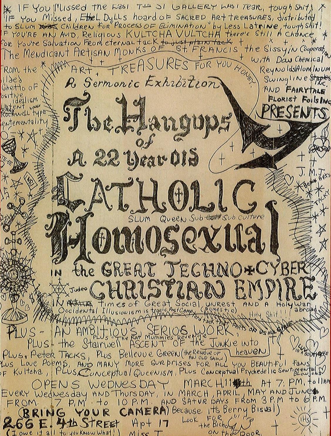 These affective qualities inform the second 1970 text described above: a xeroxed, D.I.Y. flyer Lanigan-Schmidt circulated to advertise his apartment exhibition, The Hangups of a 22-Year-Old Catholic Homosexual in the Great Techno + Cyber Judeo Christian Empire [Fig. 3].[v] In characteristic fashion, Tommy covers the surface of his flyer with writing that reflects an almost horor vacui style. He introduces the show with the following lines: