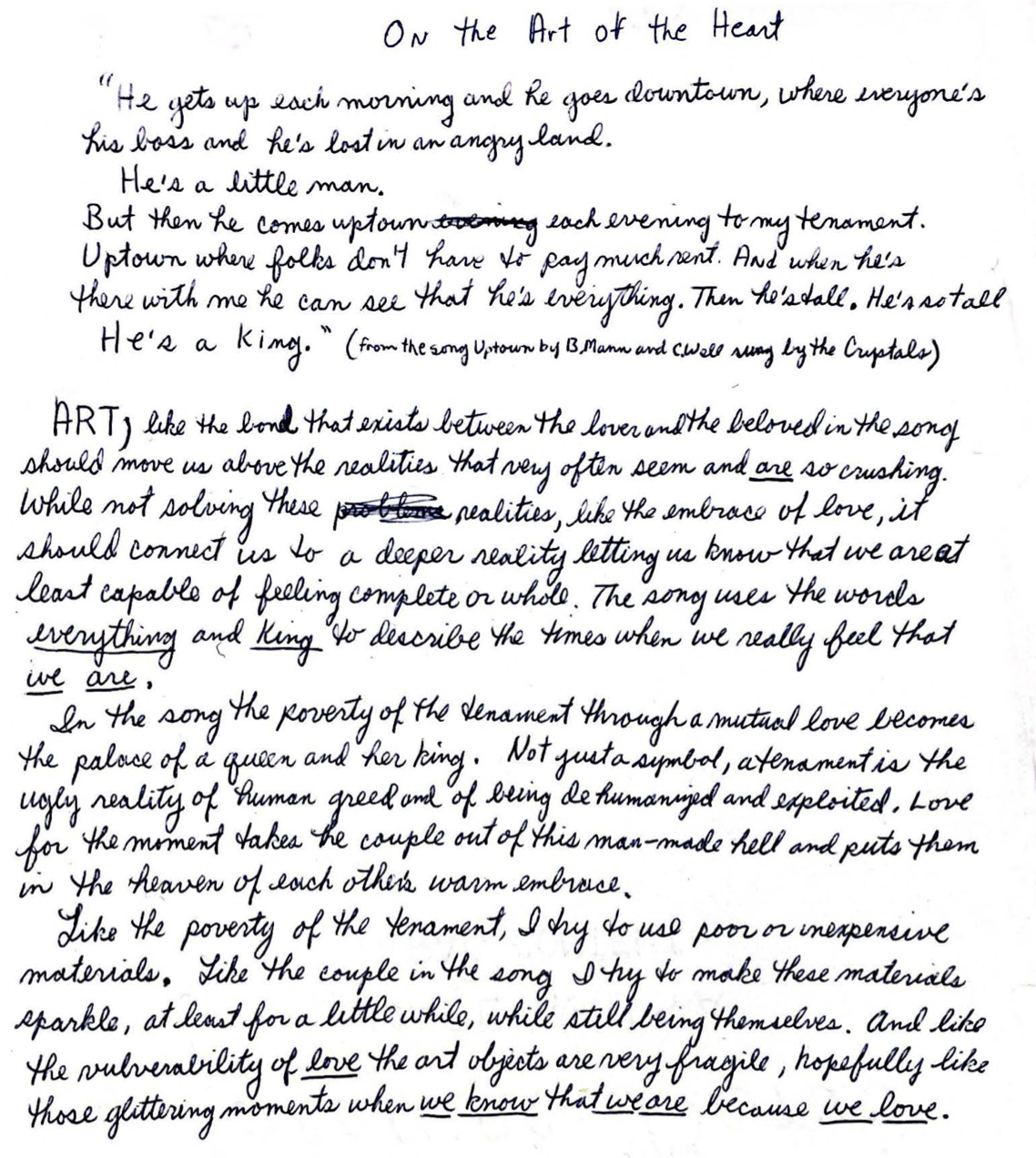 I wrap this article with another writing from Tommy titled “On the Art of the Heart.” [see fig. 12]. I hope that closing with these words will leave readers with the ineffable and divine qualities that Tommy’s glittering creations emanate: affection, adoration, love.