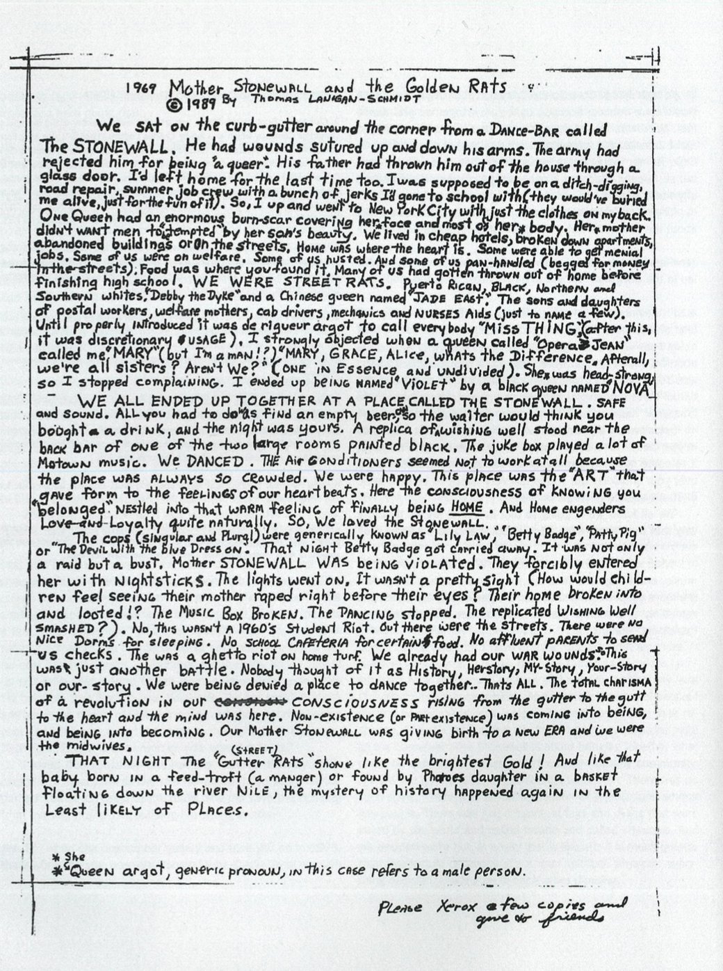 Twenty years later, he would write their origin story: “Mother Stonewall and the Golden Rats” [see fig. 11]. The text outlines Tommy’s conception of street queens as rats, declaring “WE WERE STREET RATS.” and recounts he and his friends’ protection of Stonewall against the violation of police brutality. He ends his tale: