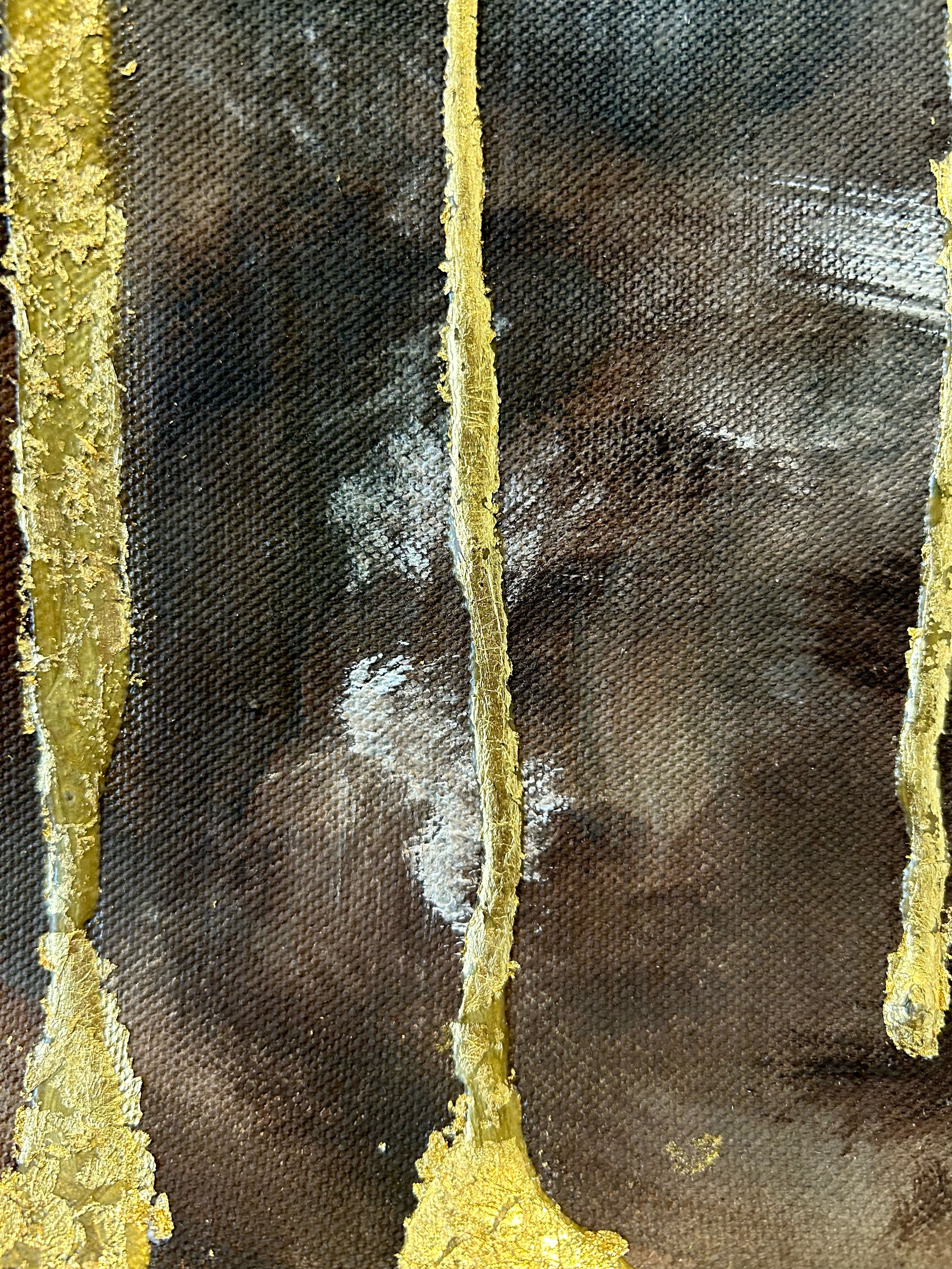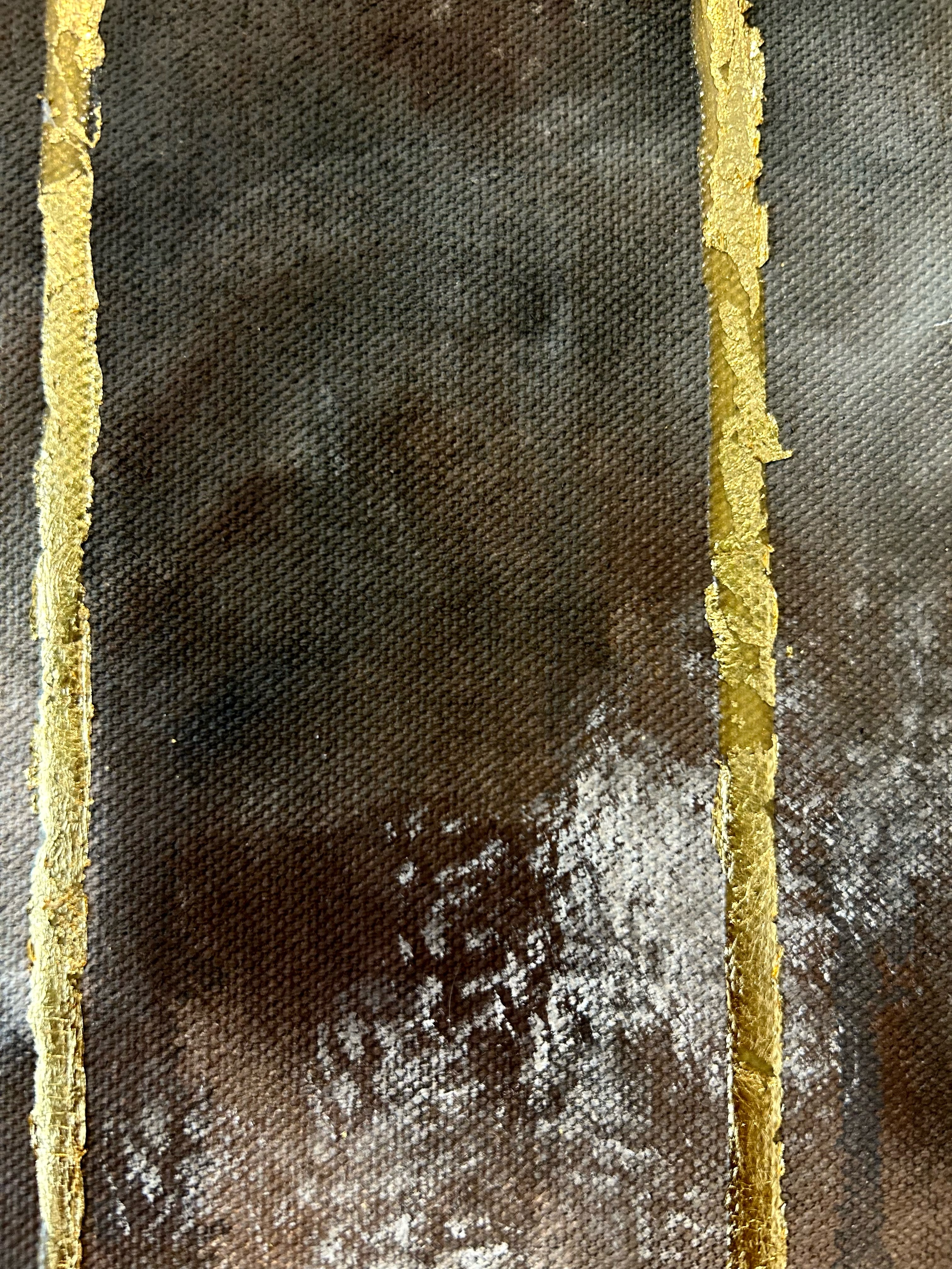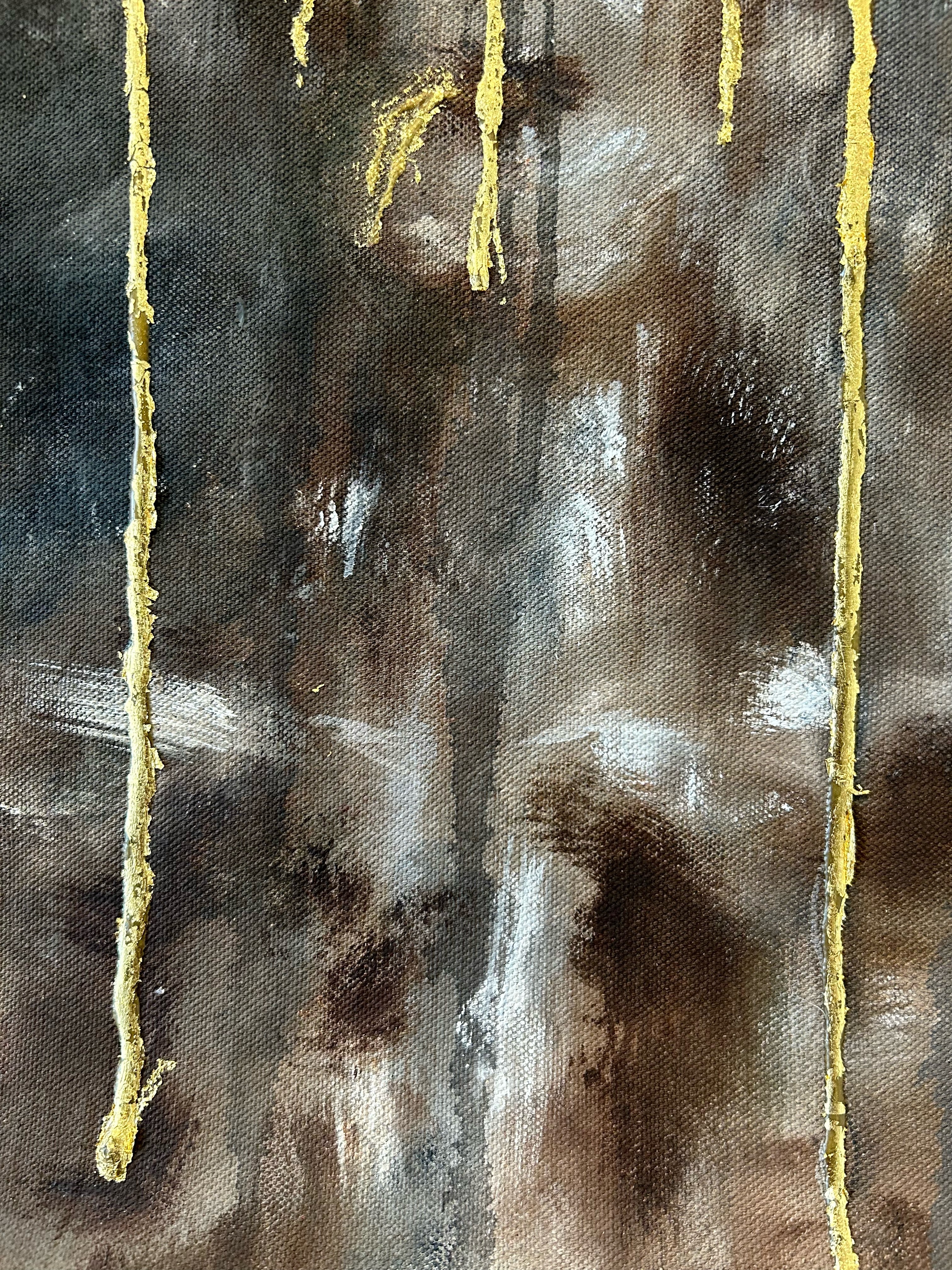 Our victim in Smog is a shade. She has been painted in a haphazard way – she is unformed and skeletal; her body barely exists. We are drawn into her hollowed out eyes, her mummified face, barely contrasted against the shadows that threaten to absorb her. Trickled over her are bright, sparkly bars, dripping across her face and slowly making their way to the bottom of the canvas. The bars are a dull gold acrylic drip, coated in imitation gold leaf, plastered on and peeling. Our shade is weeping fake gold, and it is smeared on her face with the look of it spilling out of her mouth. The most vibrant and instantly noticeable part of the piece is the glitter.
