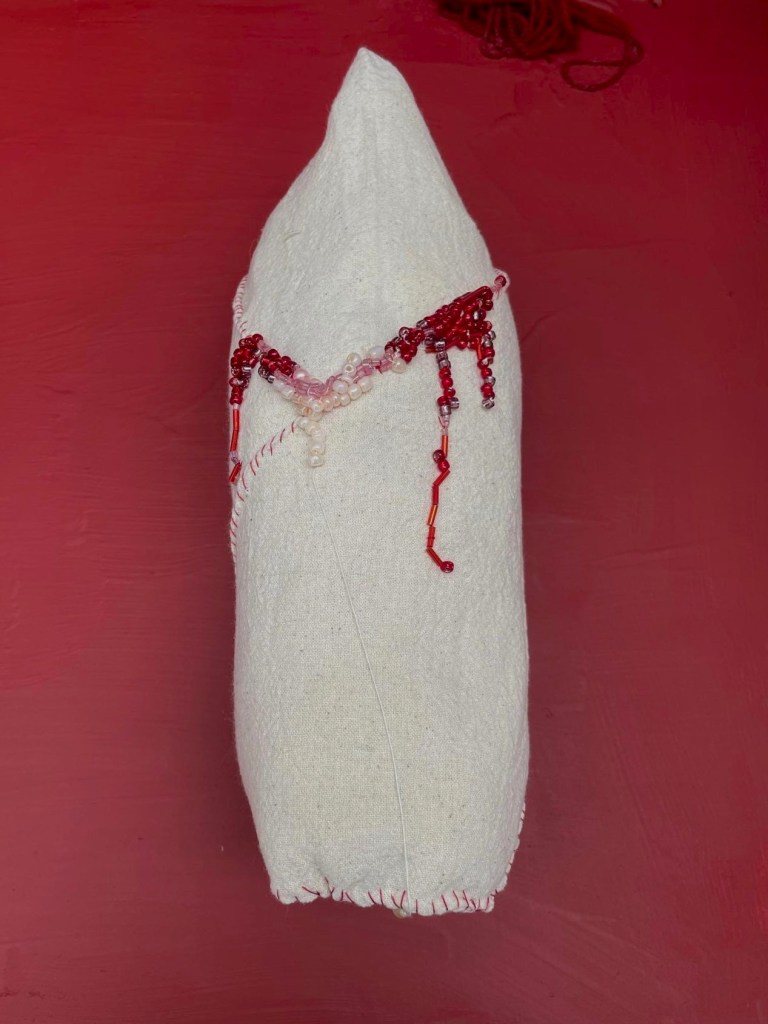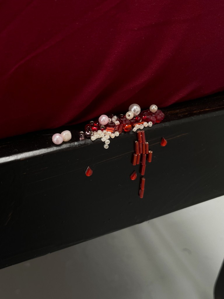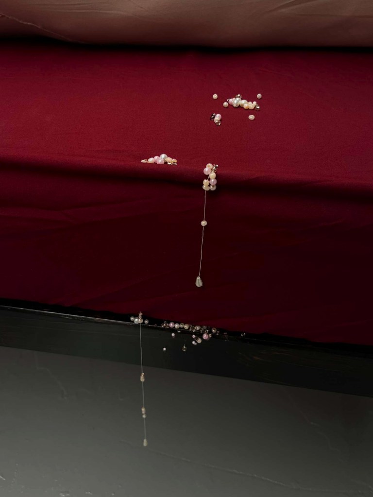 The small stained chrysalis and the other small chrysalis with red stitching are both ‘Specimens’, the big chrysalis with the beaded mattress is ‘Self Portrait (Adult)’, the beading in the embroidery hoop is ‘Seeping’. The beading on the red are detail shots of the Self Portrait. These ideas culminated in The Human Chrysalis Project, with some of these pieces including beadwork to evoke blood and fluid. This detailing – the simulated moisture connoting something living and growing – is also a visual representation of the behaviour and emotionality of queerness: it must be expressed one way or another.