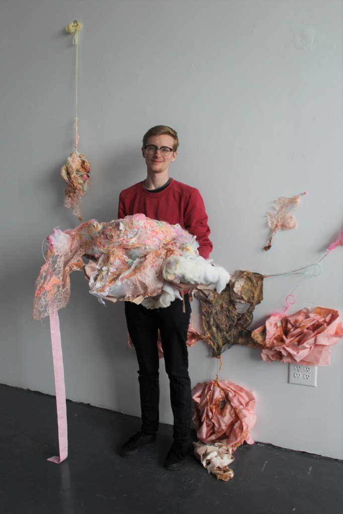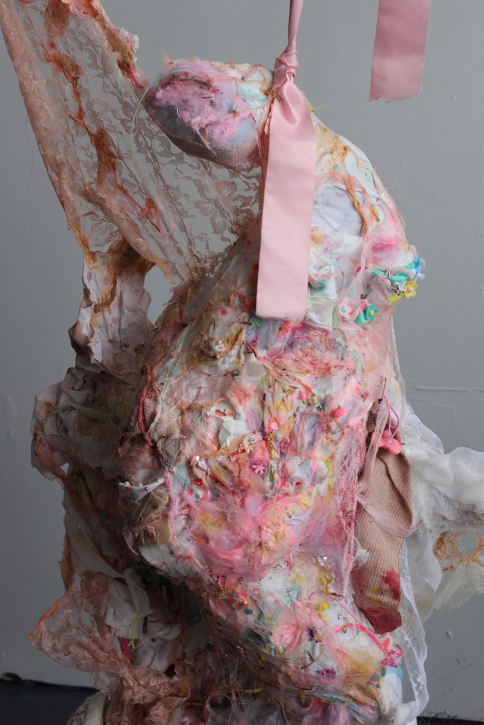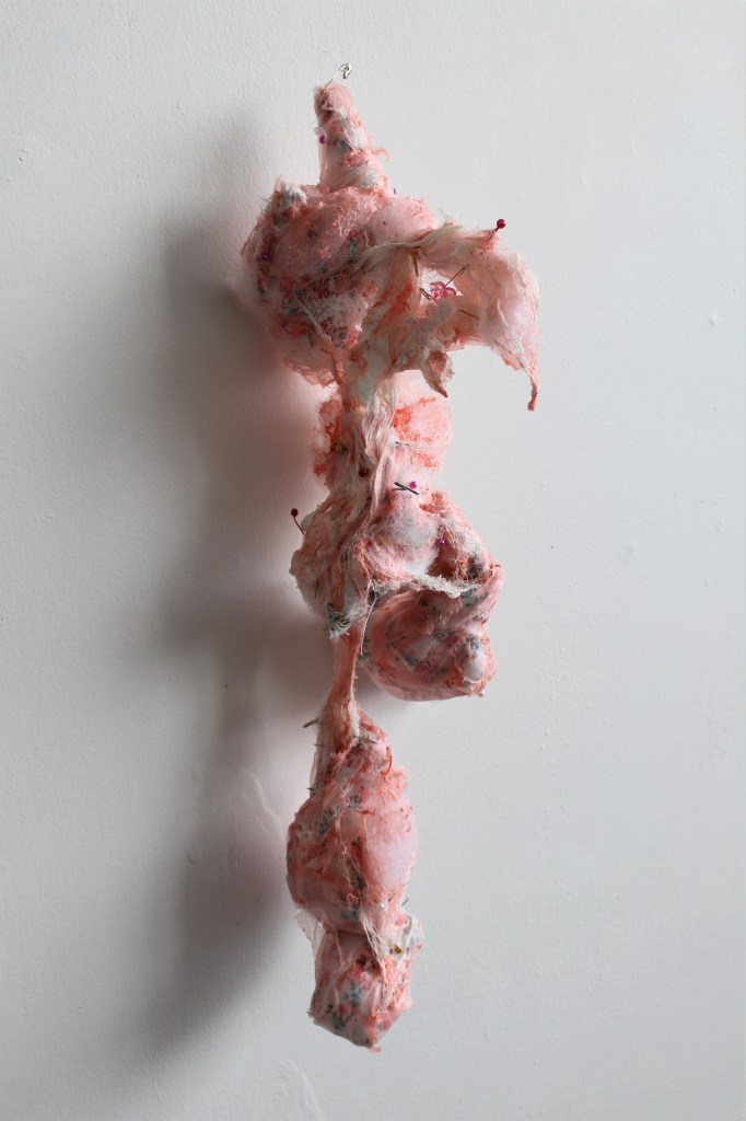 Bio: Theo Trotter’s work references the trans body as a palimpsest, through the marks of transformation and trauma that manifest on it. It deals with the idea of transformation as a necessary and transcendent, but simultaneously painful experience by utilizing the tension between beautiful and disgusting visual elements. This conflict between attraction and repulsion also represents injury and healing. He utilizes a variety of different media including textiles and latex. What many of his materials have in common is a pliability and fragility that mimics the flesh. He is drawn to other materials, such as lace, because of the closeness and intimacy to the skin that they evoke. Touch is an essential part of his process, and sometimes remains visible in the work as imprints in the materials.