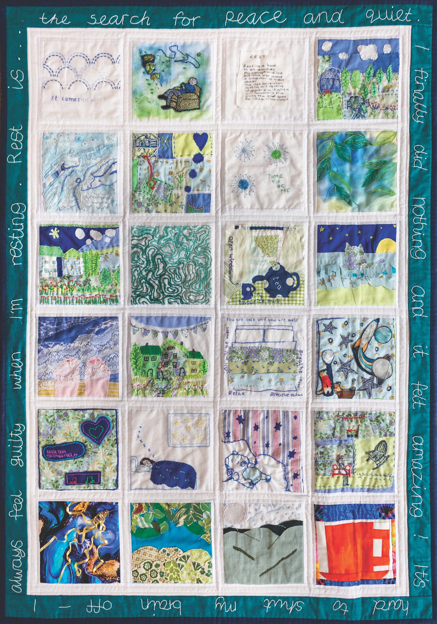 The quilt was created through a series of workshops with women from the Cambridge Women’s Resource Centre (CWRC). The CWRC has offered educational courses, creative group activities and individual support to the women of Cambridge for over 40 years. They can help women with a range of issues, including housing, education, finding work, health and wellbeing and much more. The workshops were very conversational and revealed deeply personal reflections like the guilt around doing nothing, the struggle to fall asleep with a racing mind, or the comfort of a cat or a cup of tea. These stories shaped each fabric square with colour, imagery and text chosen in response to lived experience. The quilt is essentially a collective portrait of how rest is felt, desired and sometimes resisted in our local community.