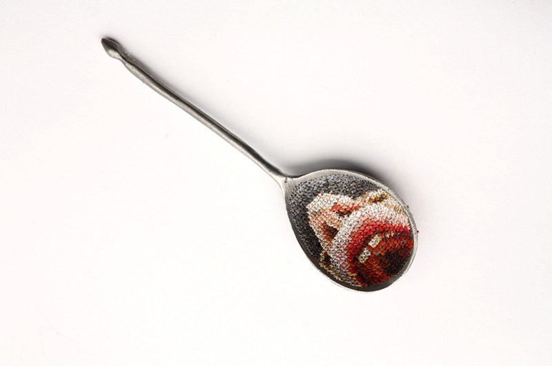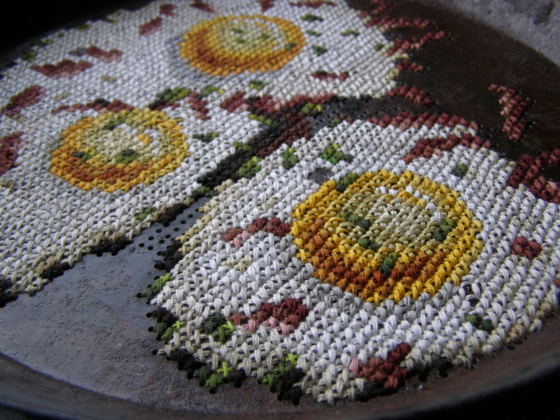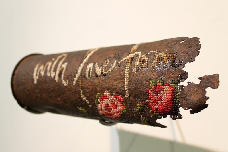 The embroidery works of Lithuanian artist Severija Inčirauskaitė-Kriaunevičienė takes texture to a new level. She takes metal as her starting point – buckets, spades, even cars – and stitches into them. Challenging the domestic association with embroidery, these found objects are placed into the public realm. The kitsch cosiness that Inčirauskaitė-Kriaunevičienė associates with cross-stitching is given a twist as she pokes through metal gives new life to discarded objects. She draws on a post-Soviet landscape in Lithuania in her work, as she writes on her website “in the postwar years, our grandmothers stitched tablecloths in the villages, and the paths were so decorated, and in the Soviet era, our mothers made crossed cushions and napkins through household lessons”. This intergenerational skill-sharing is then developed in her practice, to question sentimentality and access to embroidery practices. She doesn’t want to make “private kitsch for private interiors” but rather expose the work, patience and mindfulness that goes into the cross-stitch practice. Taking the floral designs from hobby magazines, these “popular culture citations” make us look back at the origins of the techniques. These established traditions recontextualise the objects they adorn – whether that’s on broken gun shells or metal spoons. Imbued with new use, these forgotten objects might tap into a nostalgic aesthetic but actually point us towards history in a new way.