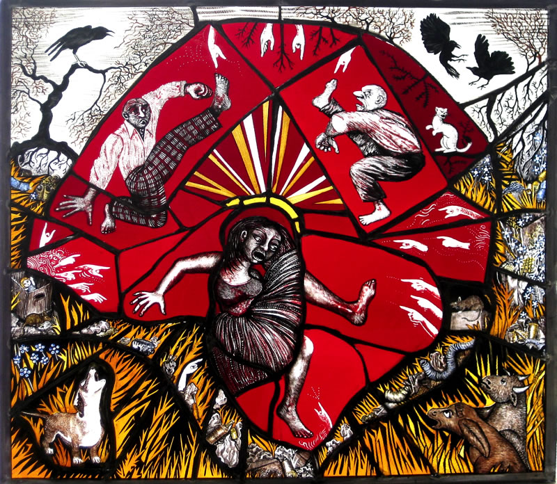 Pinkie Maclure is an artist using the allegorical power of medieval stained glass as a vehicle for contemporary expression. Stained glass was invented in the 12th century to communicate to a largely illiterate population, its vivid colours having a seductive quality that’s hard to resist. However, its narrative role has been largely abandoned in recent years, which is something she hopes to change by making work that reflects the world around us today.