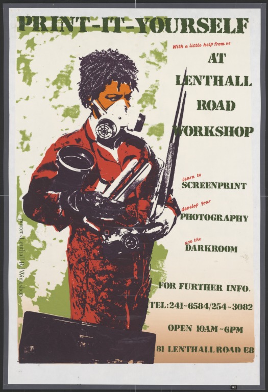 If you stepped through the ordinary-looking front door of 81 Lenthall Road in the 1970s and 80s, you’d be forgiven for thinking that you’d stumbled on a covert military operation. In this shabby townhouse down a quiet street in Hackney, East London, you’d find women kitted out in boiler suits, respirator masks, and thick gloves moving around chemicals and heavy-duty equipment. The artist Claudette Johnson, a member of the Lenthall Road Workshop, recalls feeling like ‘guerilla fighters’, ready to ‘change something in society’. The revolution they were planning, however, was a peaceful one: their weapons were cameras, screen-printing materials, and the power of a community united by desire for social change, and they were fighting to ‘change how women were viewed in society’. Posters and other printed material made by the group are currently on display in a small but inspiring exhibition at the Hackney Museum, which traces the history of the feminist Lenthall Road Workshop from its beginnings as a community silkscreen and photography service in 1975, to its collaborations with groups such as Women’s Aid, the Black Lesbian and Gay Support Group, and Hackney Urban Studies Centre throughout the 1980s, and ending with its ultimate loss of funding in 1993.