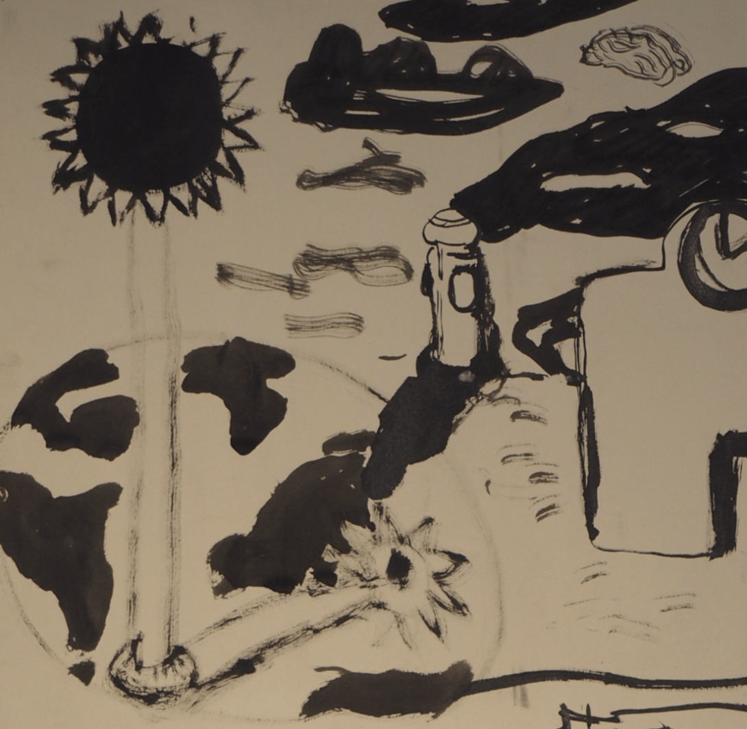 I decided to explore the way the beauty industry affects us and our environment. The central figure is based around a classic madonna, but she has liposuction lines on her torso and hypodermic needles and scalpels adorning her halo. Her nipples have been censored. Two little girls gaze up at her beautiful pink frock from a grey world of abandoned plastic containers. Above her, medieval scales traditionally used to symbolise the ‘weighing of souls’ refer to the long-running L’Oreal ad ‘worth it, not worth it’. A woman fires a gun at a mirror, smashing it to smithereens. To her left, a ‘kindly’ grandmother knits a web of Barbie dolls and to her right is a bulimic Rapunzel. The palm trees refer to the palm oil industry, the roses symbolise feminine beauty. At the top, Satan is hopping across the towers of Oxbridge with a pile of books heaped on his back, stealing all the knowledge while the women are distracted”