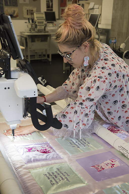 My quilted art practice begins with the physicality of drawing and painting, and shifts to the immateriality of the screen. It collages together and re-assembles my drawings into digital print and embroidery designs. Finally, the work is shifted back into the material through the processes of stitching, embroidering and quilting.