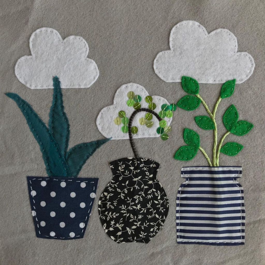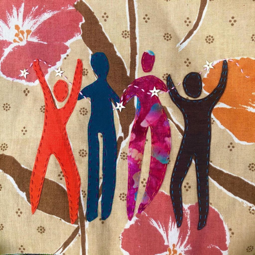 “I can only manage relatively simple things at the moment but it’s lovely to feel connected to collective projects and I tried to show this with the line of stitches flowing through the figures, light and growing stars; backing is vintage from my mum who is the background to everything I make”