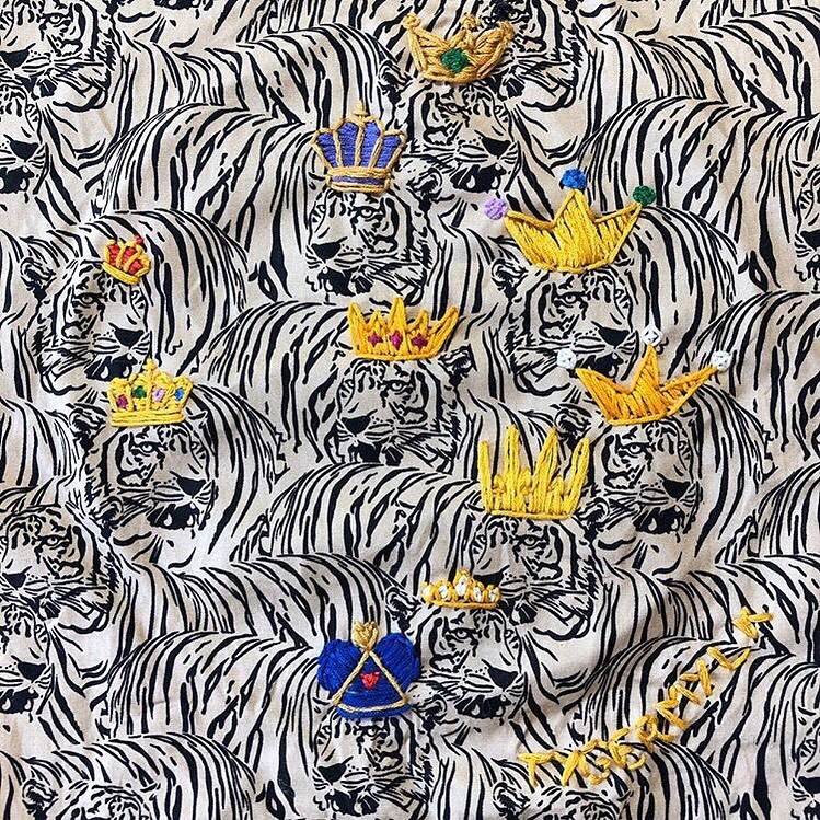 “I decided to start making and selling tiger themed masks to my fans with the idea that every mask purchased, one would go free to a key worker in my community. Some of them haven’t been provided with any kind of protection in their job. One has gone to a brain surgeon in the ICU, another to my mate who works in Waitrose, another to my postman. I’ve been in isolation since before the lockdown because I am immunocompromised so this was a way I could contribute to my community while making use of the little online one our music has created. It started off with some fabric that I’d used for a backdrop for one of my shows and when that ran out I bought this amazing tiger print. I’ve now bought the last remaining ream i could find in the UK because I’ve had so many requests and orders! I used a remnant to make this Tiger King/Queen themed patch because it’s a mad phenomenon that everyone will remember having watched in quarantine.”