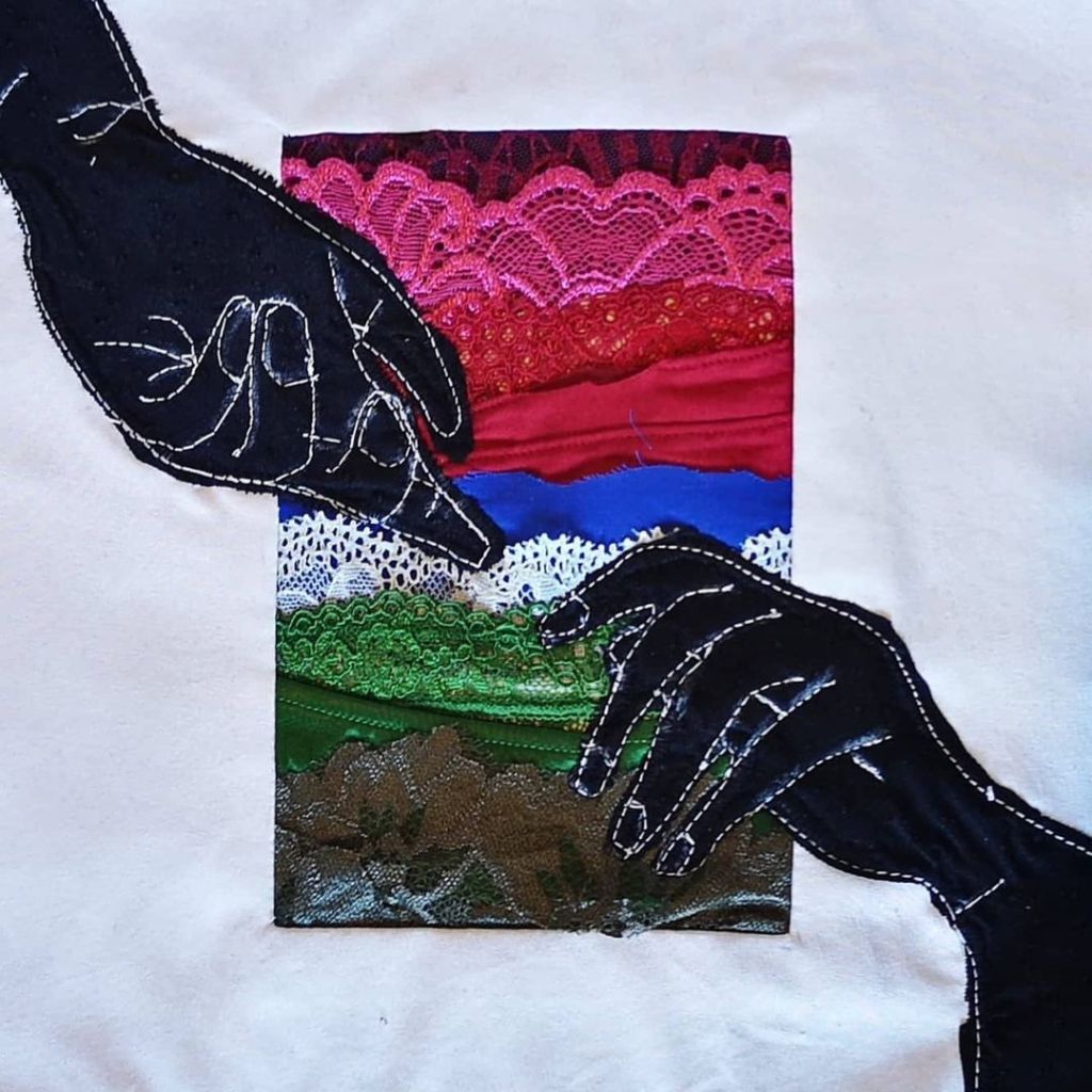 “Reaching out to each other without the physical touch during these socially distancing times. The lace in this patch is taken from old knickers I was throwing away – waste not want not 👙”