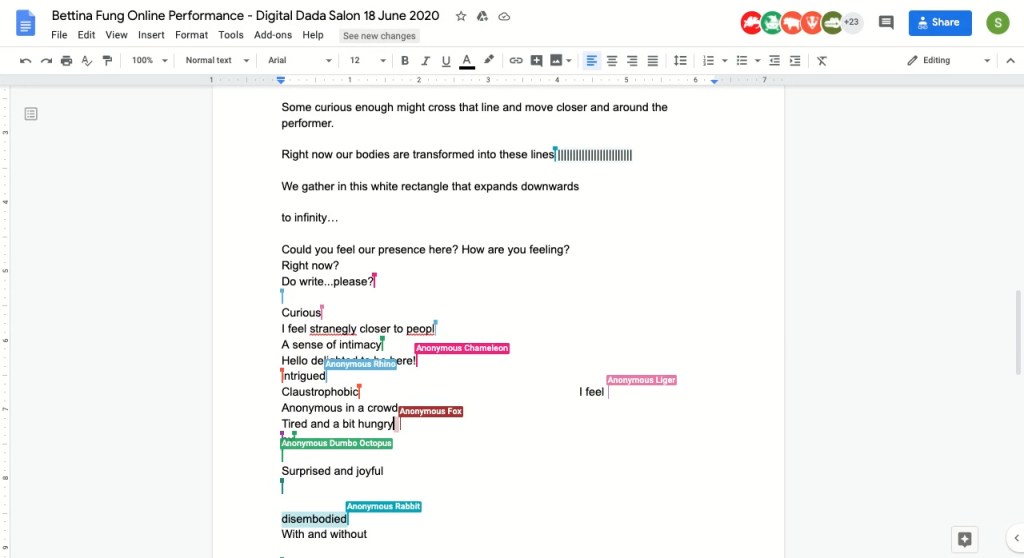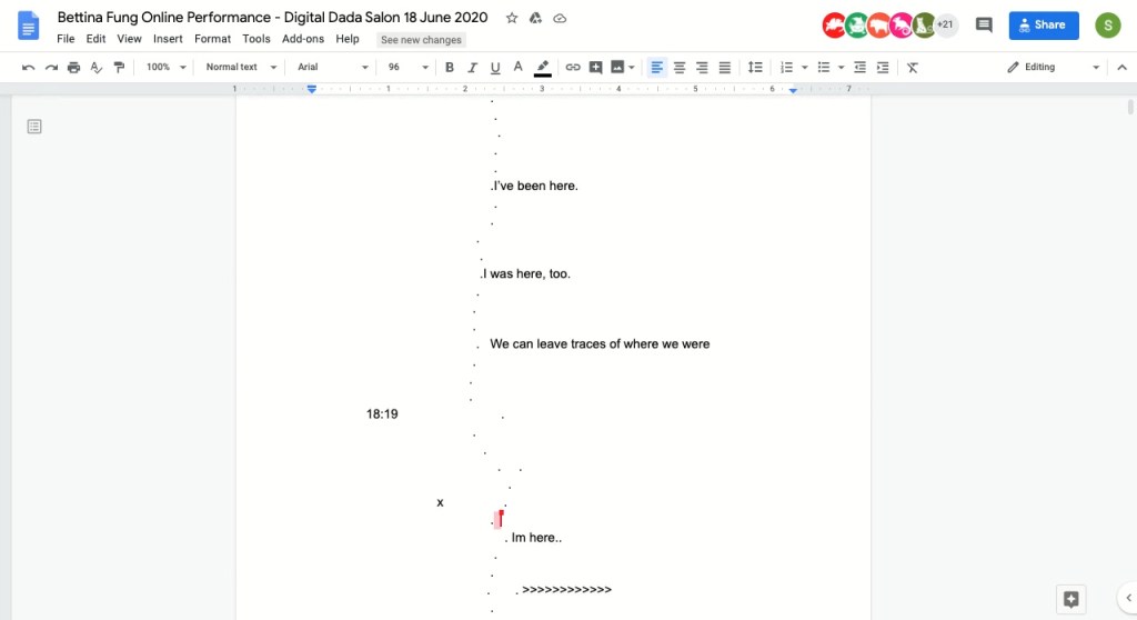 “With Covid-19 and lockdowns suspending live performances, Fung became curious about other ways of presenting and creating live art online, particularly thinking about the ability to experience liveness and feeling presence online. She decided to experiment with Google Docs, an online word processor that enables multiple users interacting simultaneously on the same document, and using its infinitely expanding white rectangular pages as a site for performance.”